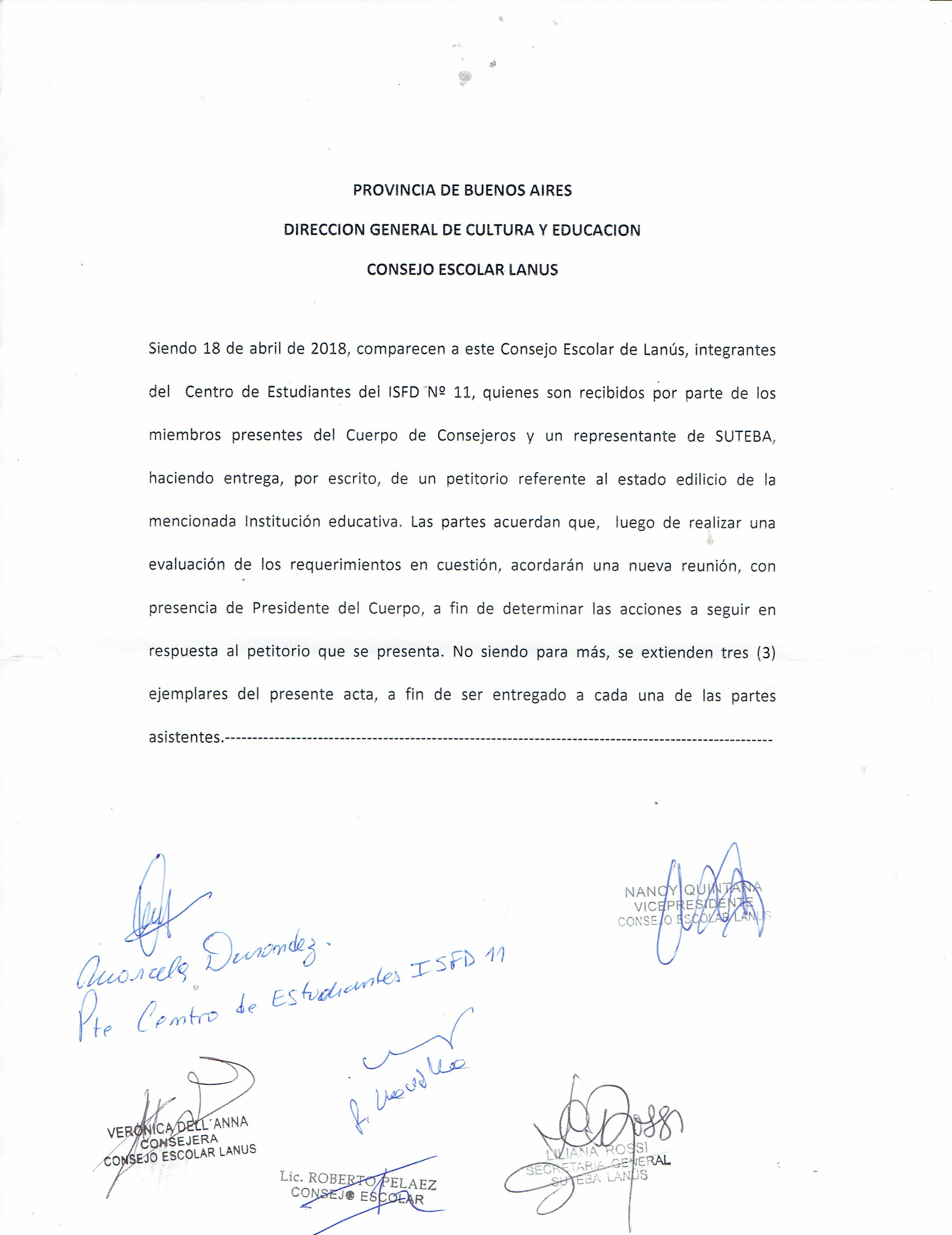 En el día de la fecha, 18 de abril, la Secretaria General de SUTEBA Lanús Liliana Rossi, junto a representantes del Centro de Estudiantes del ISFD 11 nos presentamos en el Consejo Escolar. Con la presencia de Nancy Quintana, vicepresidenta, y de los consejeros Veronica Dell' Anna, Roberto Pelaez y Roberto Crovela, los estudiantes plantearon las dificultades edilicias y de seguridad que posee el ISFD 11