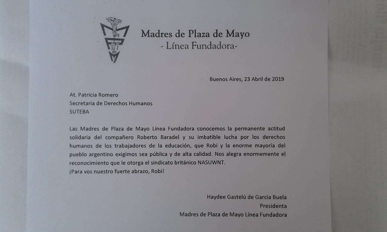 Compartimos una carta enviada por las Madres de Plaza de Mayo Línea Fundadora, que nos enorgullece y nos hace sentir que esta Organización Sindical, con la conducción del compañero Roberto Baradel, sigue el camino signado por ELLAS en la defensa de los DDHH, en la lucha contra la impunidad y con la firme convicción de que la única lucha que se pierde es la que se abandona.