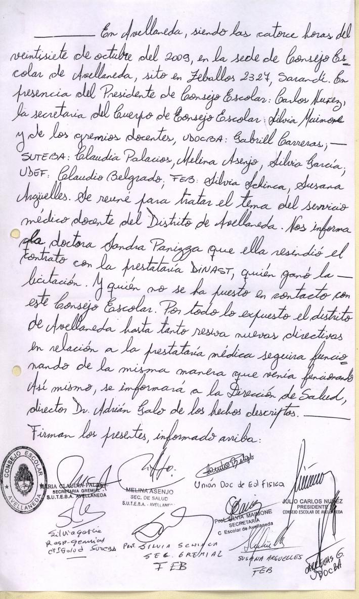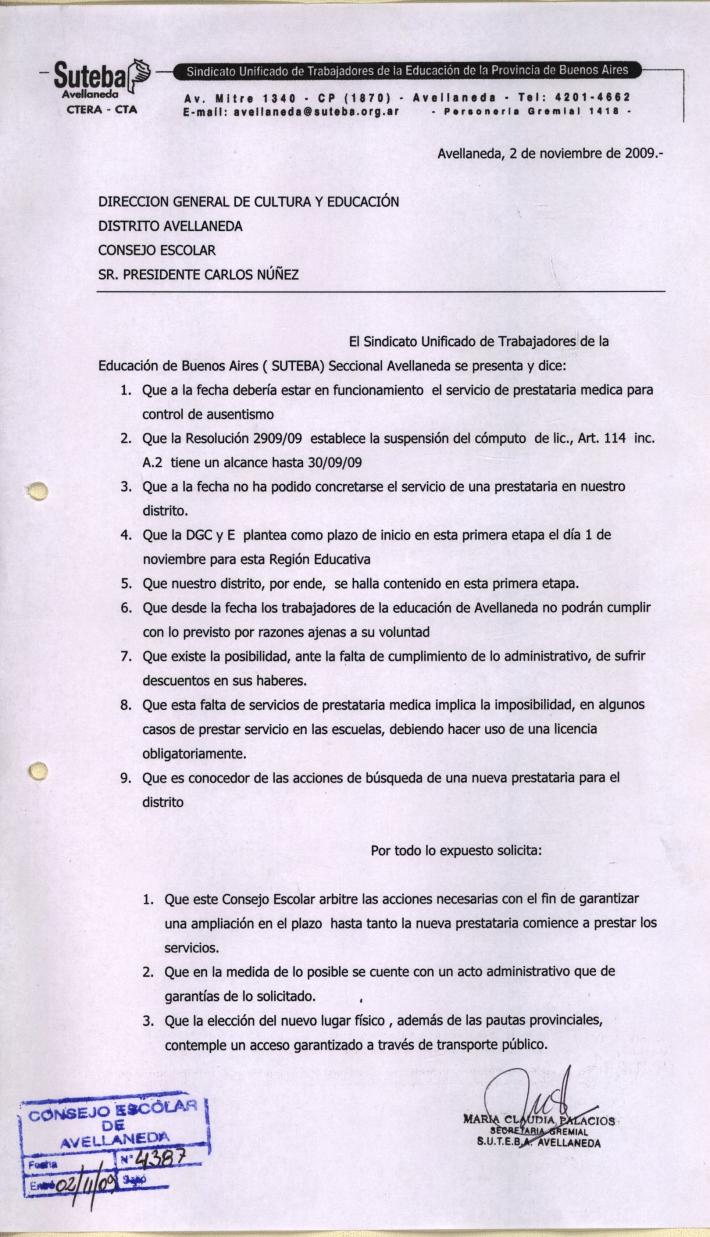 El día 1 de Diciembre de 2009 hemos recibido telefónicamente del Consejo Escolar de Avellaneda el siguiente comunicado: “A partir del 2 de diciembre de 2009 en la AV. Pavón 2092 funciona el nuevo reconocimiento medico de 8 a 15 horas. “ Dado que el día 30 de octubre los sindicatos docentes mantuvimos una reunión con Consejo Escolar en la cual acordamos: Reunión previa con la prestataria , C. Escolar y gremios para consensuar el funcionamiento del mismo. Reunión con los directivos de las escuelas ,Consejo Escolar y los gremios para comunicar el funcionamiento del mismo y garantizar que todos los docentes se notifiquen de la nueva prestataria. Tal acuerdo no se cumplió por parte del Consejo Escolar, así como tampoco a la fecha no se pudieron garantizar las cadenas telefónicas a la totalidad de los establecimientos , por lo cual y con objetivo de preservar los derechos de todos los compañeros docentes, estamos concretando una presentación al Consejo Escolar con copia a la Jefatura Distrital, reclamando se cumpla con lo acordado en la reunión del 30 de octubre. Les solicitamos que ante cualquier inconveniente se acerquen al sindicato.- Lugares para tramitar las licencias : Según el domicilio particular : Avellaneda: Av. Pavón 2092 de 8 a 15 hs. Para médico a domicilio llamar al consejo escolar, teléfonos: 4203-5131/ 4605 o 4204-4599 Lanús: lavallol 80 de 12 a 19 hs - Lanús oeste Lomas: Cochabamba 220 1º piso de 8 a 14.30 hs – Banfield