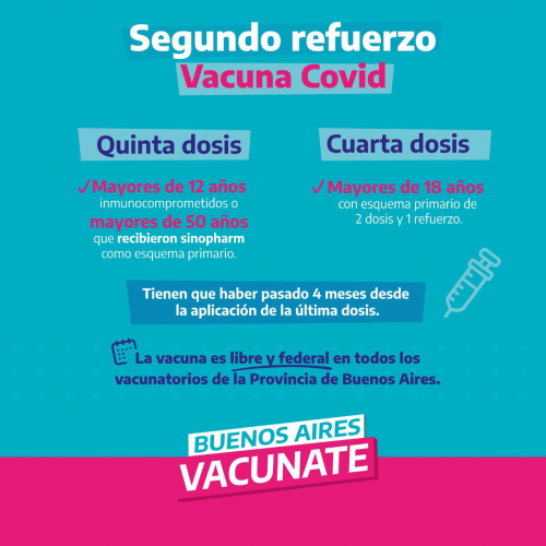 En la provincia de Buenos Aires se aplica también una quinta dosis de la vacuna contra el COVID 19 a las personas mayores de 50 años que recibieron como primeras 2 dosis la vacuna Sinopharm, y a las personas inmunocomprometidas mayores de 12 años.