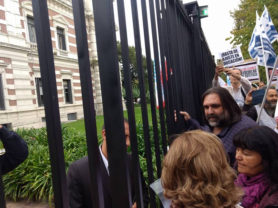 En el marco del conflicto provincial docente, el Frente de Unidad Docente Bonaerense entregó el miércoles 2 de mayo una carta dirigida a la gobernadora María Eugenia Vidal. En la Casa de Gobierno de la provincia de Buenos Aires les cerraron las puertas en la cara y lxs hicieron esperar bajo la lluvia. Finalmente, pudieron entregar la carta sin pasar la reja tras una larga espera.