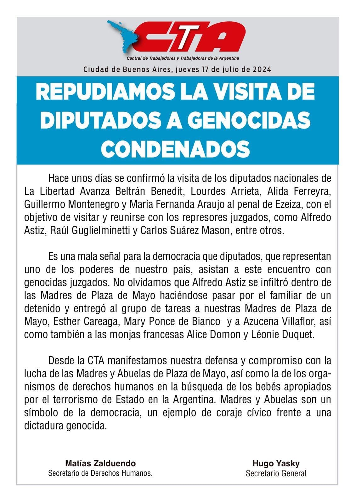 Desde la CTA manifestamos nuestra defensa y compromiso con la lucha de las Madres y Abuelas de Plaza de Mayo, así como la de los Organismos de Derechos Humanos en la búsqueda de los bebés apropiados por el terrorismo de Estado en la Argentina. Madres y Abuelas son un símbolo de la Democracia, un ejemplo de coraje cívico frente a una dictadura genocida.