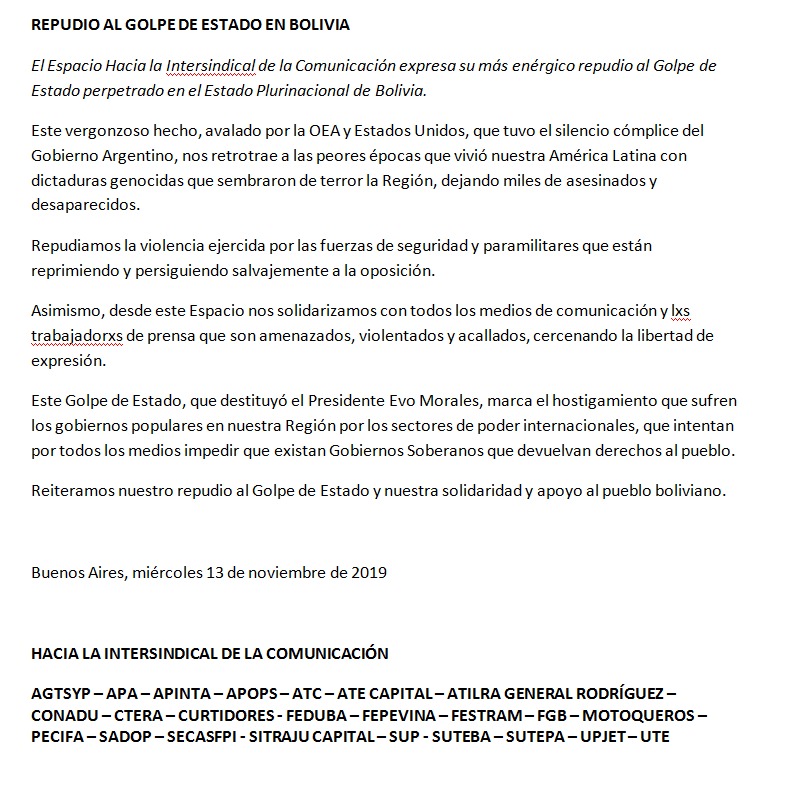 El Espacio Hacia la Intersindical de la Comunicación expresa su más enérgico repudio al Golpe de Estado perpetrado en el Estado Plurinacional de Bolivia.