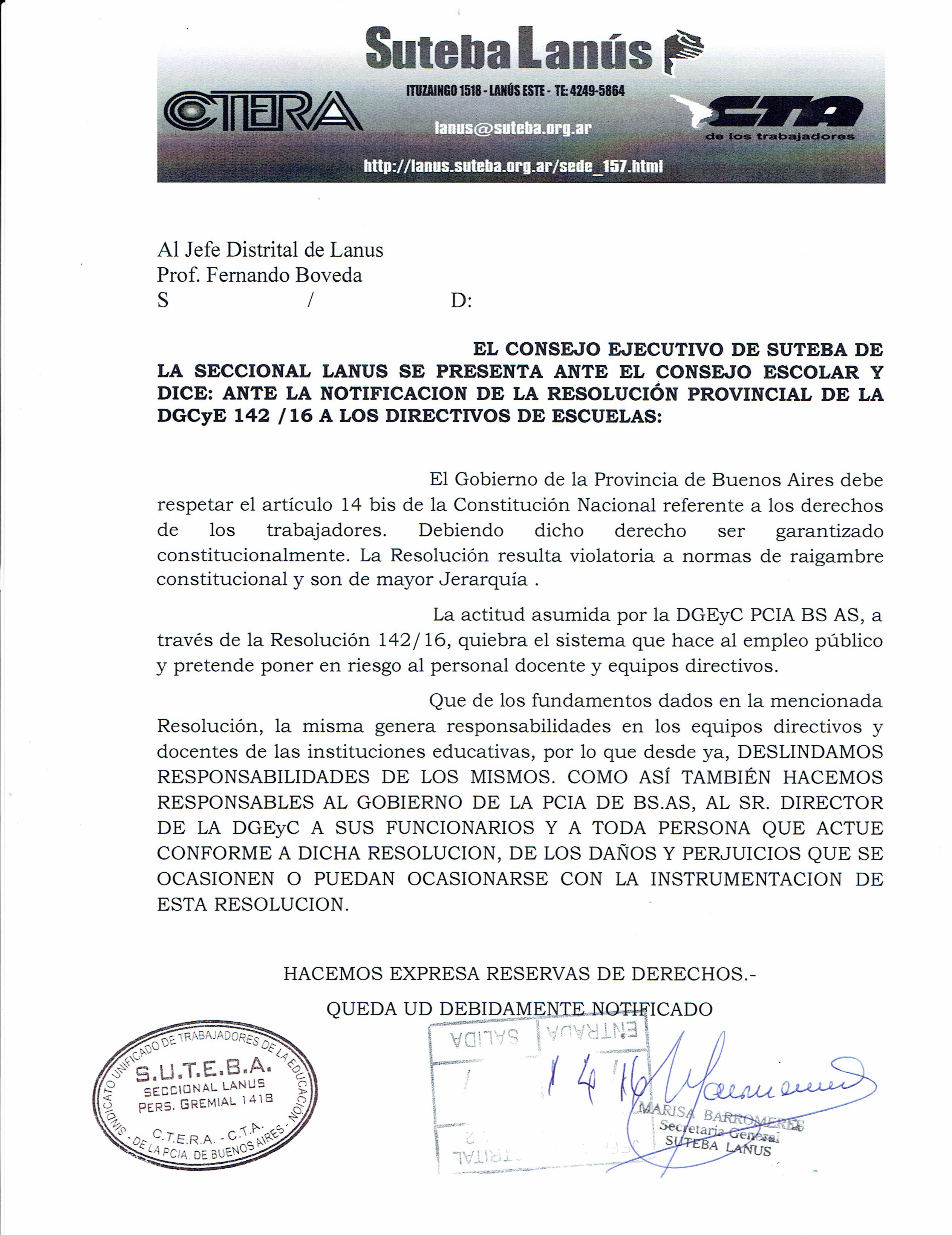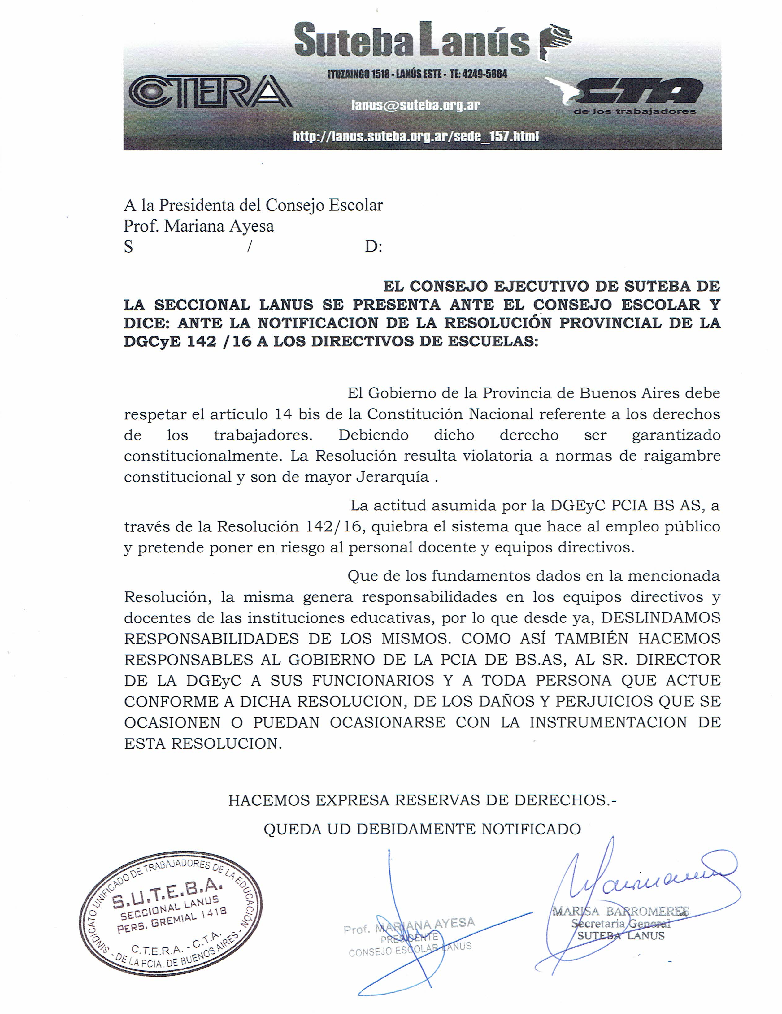 En el dia de hoy SUTEBA realizó la presentación ante Consejo Escolar y Jefatura en relación a la Resolución 142/16 emitida por la DGCyE, que se adjunta.