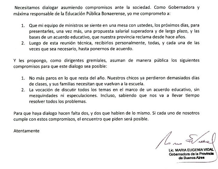RESPUESTA DE LA GOBERNADORA VIDAL AL PEDIDO DE DIÁLOGO DE LOS GREMIOS