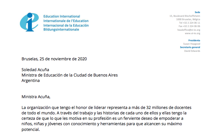 Fragmento de la carta de David Edwards, Secretario General de la Internacional de la Educación.