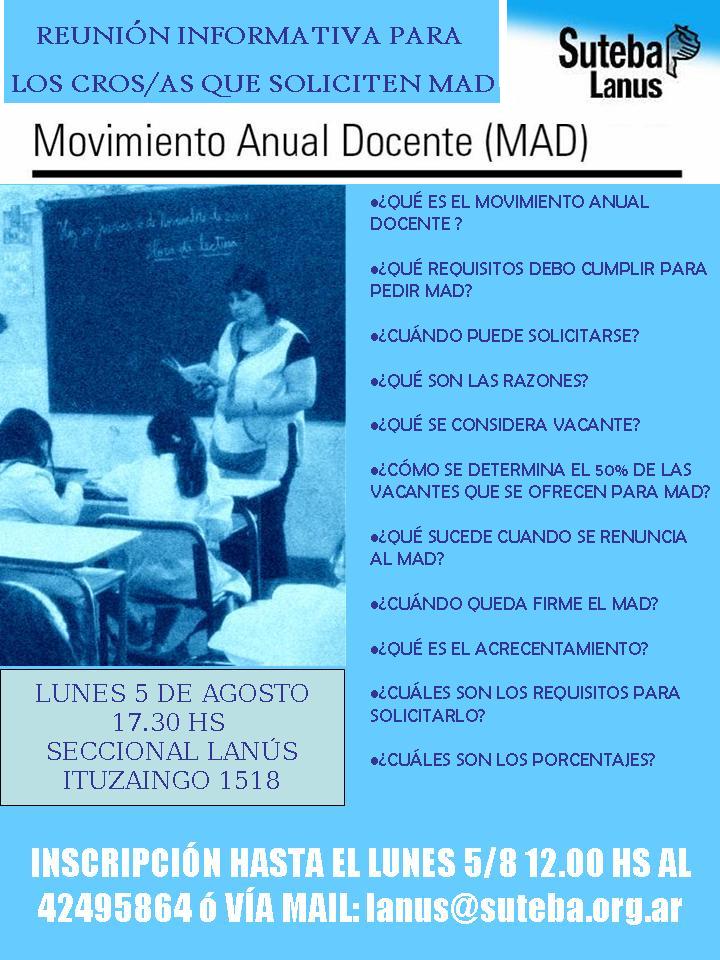 El día 5/8 con la presencia de compañeros de todos lo niveles y modalidades se realizó la reunión para los cros que solicitarán MAD. La misma estuvo a cargo de Claudia Dávila, Secretaria Gremial de SUTEBA Lanús y de Silvia Lamas Sub. Secretaria Gremial de SUTEBA Lanús.