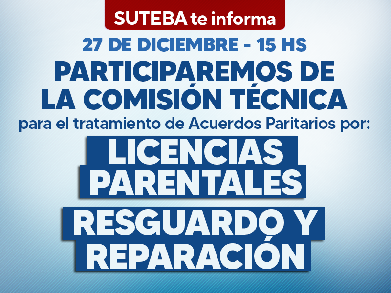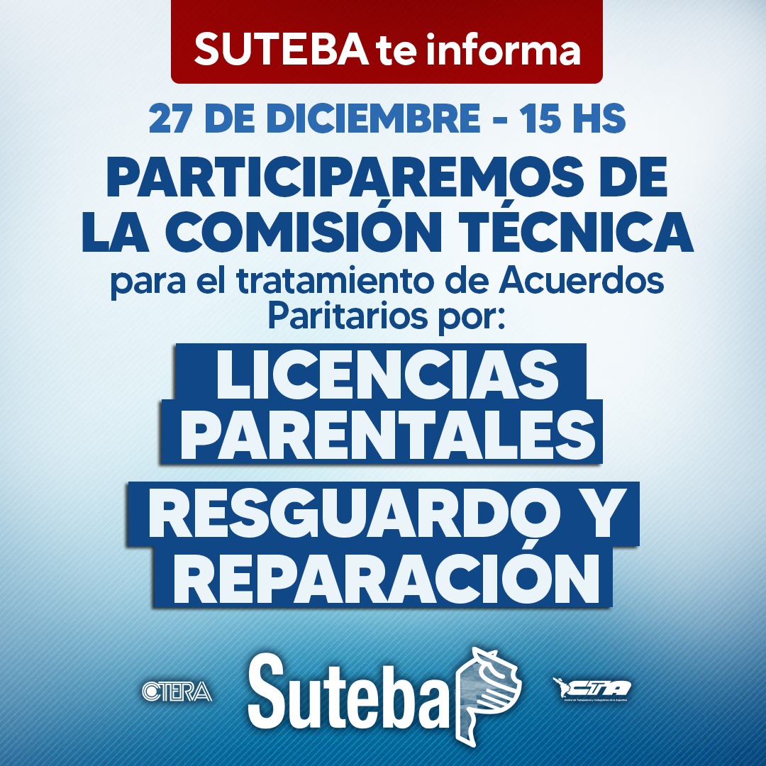 De acuerdo a lo solicitado por el Frente de Unidad Docente Bonaerense, se convocó para mañana, martes 27, a la Mesa Técnica de Condiciones Laborales en el marco de la PARITARIA GENERAL, para avanzar en el tratamiento de Acuerdos Paritarios de Licencias Parentales y de Resguardo y Reparación.
