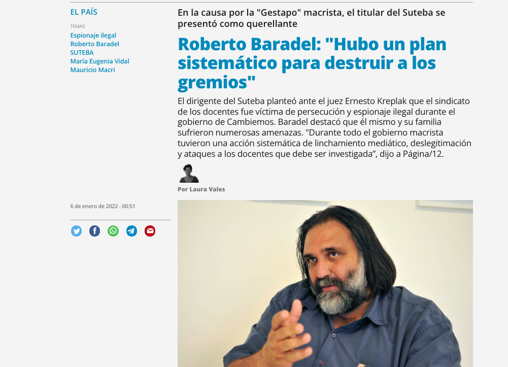 "El dirigente del Suteba planteó ante el juez Ernesto Kreplak que el sindicato de los docentes fue víctima de persecución y espionaje ilegal durante el gobierno de Cambiemos. Baradel destacó que él mismo y su familia sufrieron numerosas amenazas. "Durante todo el gobierno macrista tuvieron una acción sistemática de linchamiento mediático, deslegitimación y ataques a los docentes que debe ser investigada", dijo a Página/12."