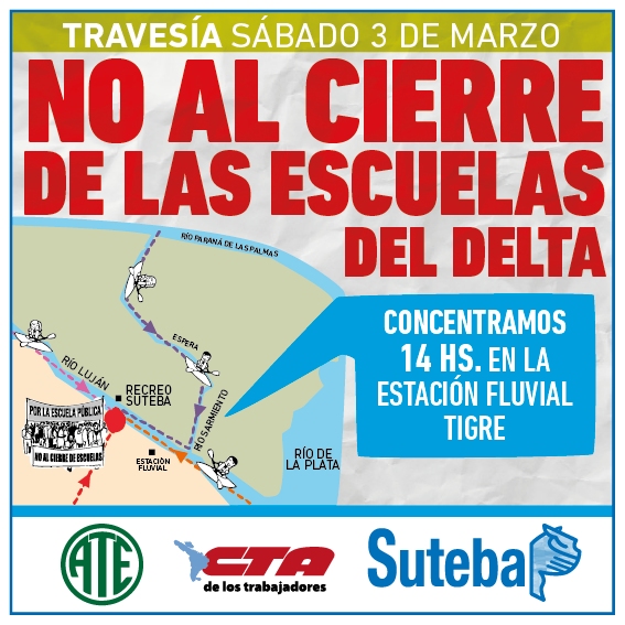 Este sábado 3 de marzo, y luego de que la Provincia diera marcha atrás en el cierre de 6 Escuelas del Delta, SUTEBA participará de una travesía de kayaks por el NO cierre de ninguna Escuela de Islas.