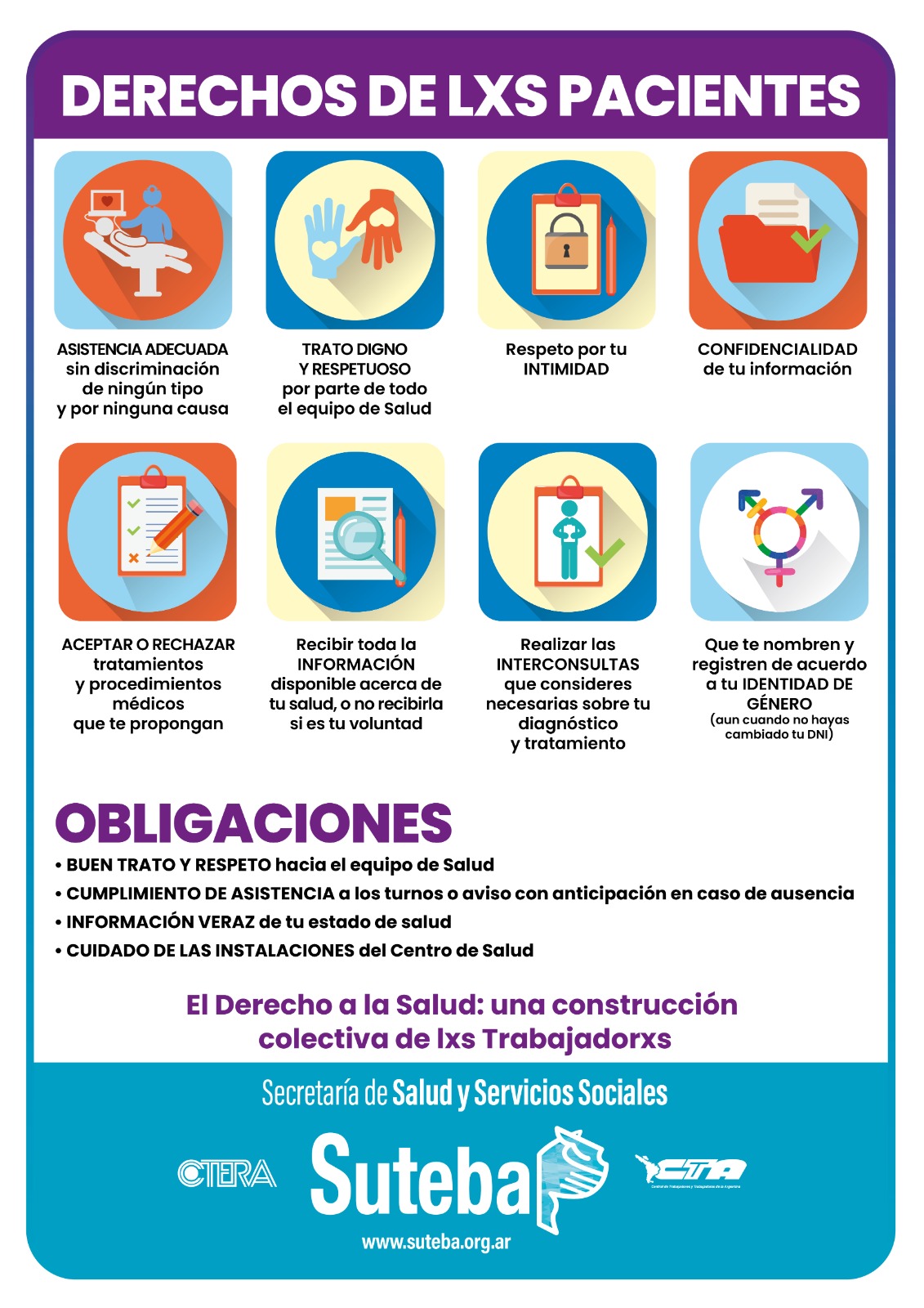 En este sentido, los Centros de Salud del SUTEBA incorporan como labor de sus equipos el dar a conocer los Derechos del Paciente en los intercambios con lxs usuarixs de nuestros Centros de Atención.