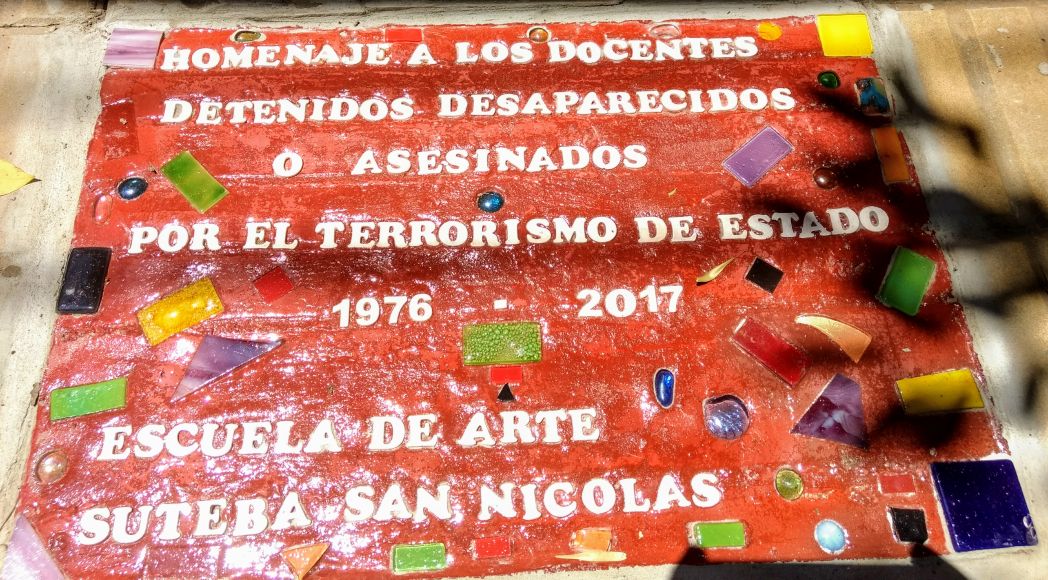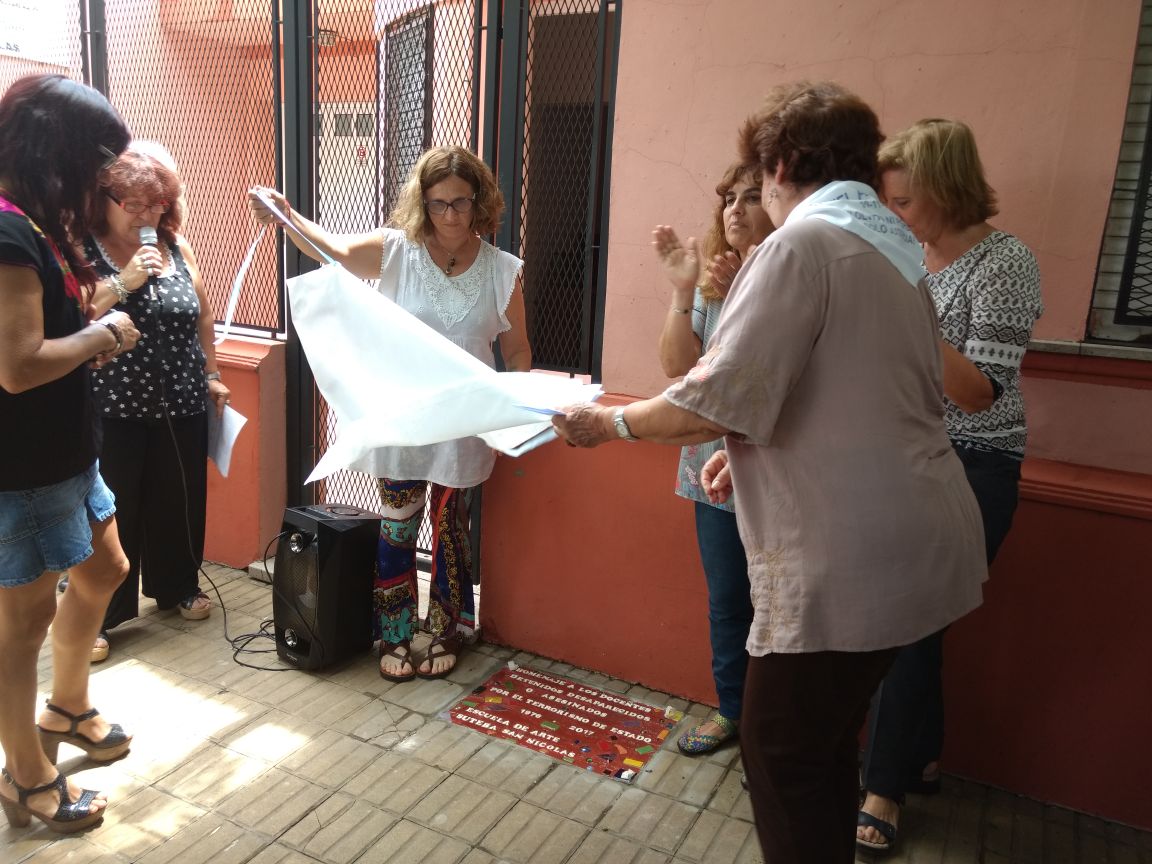 La última etapa estuvo compuesta por la colocación de una baldosa en conmemoración de los 600 COMPAÑERXS DOCENTES detenidxs - desaparecidxs durante el Terrorismo de Estado realizado por el SUTEBA, organismos de DD.HH. y la Escuela de Arte de San Nicolás. En esta ocasión, hizo uso de la palabra la Subsecretaria de Comunicaciones a nivel provincial, Bibiana Giglio, quien mencionó que las luchas que estamos dando ante las políticas de ajuste que quiere implementar este gobierno deben ser las mismas que dieron nuestros compañerxs detenidxs - desaparecidxs en pos de un mundo más justo y mejor.
