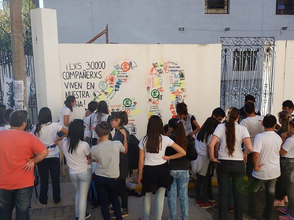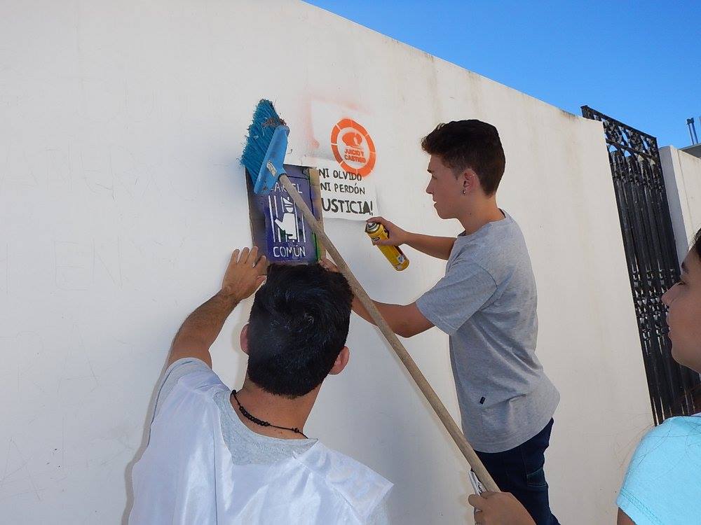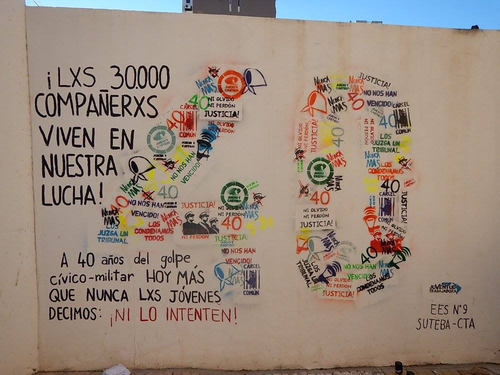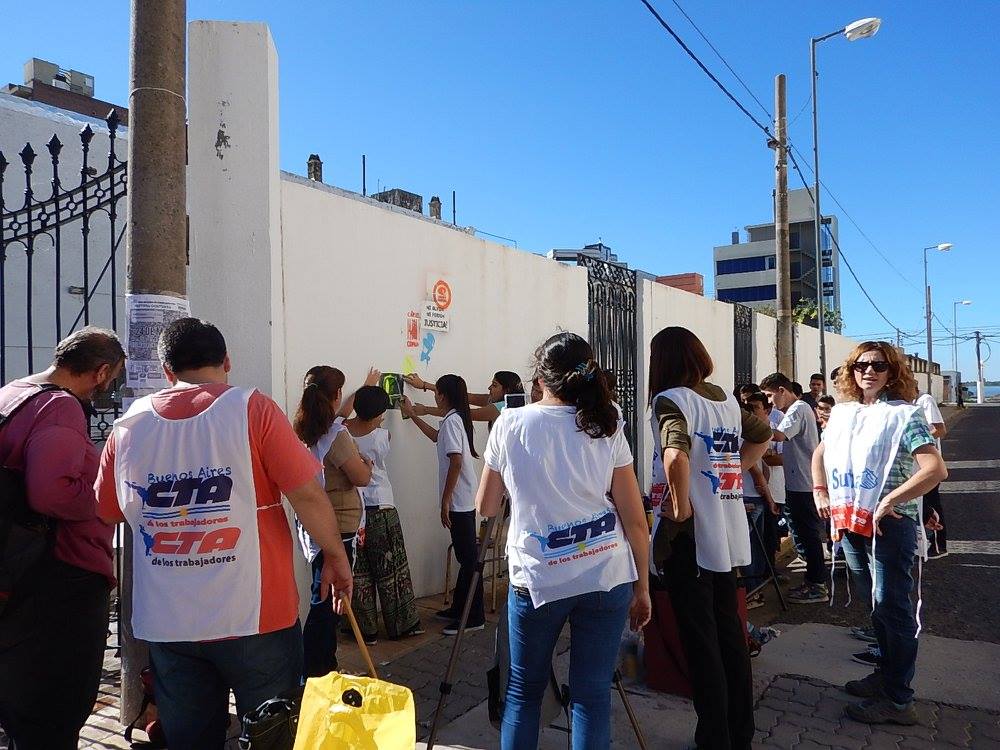 La Juventud de la CTA San Nicolás-Ramallo, junto con la EES Nº 9, realizaron un mural en el exterior de la escuela para conmemorar los 40 años del golpe genocida. Acompañados por SUTEBA, autoridades y docentes de la escuela, e integrantes de la Mesa de la Memoria por la Verdad y la Justicia, la Juventud de CTA de los Trabajadores y estudiantes del Colegio Nacional hicieron un homenaje a los 30.000 compañeros detenidos-desaparecidos y plasmaron en un mural su sentir y firme convicción: Dictadura nunca más, democracia nunca menos.