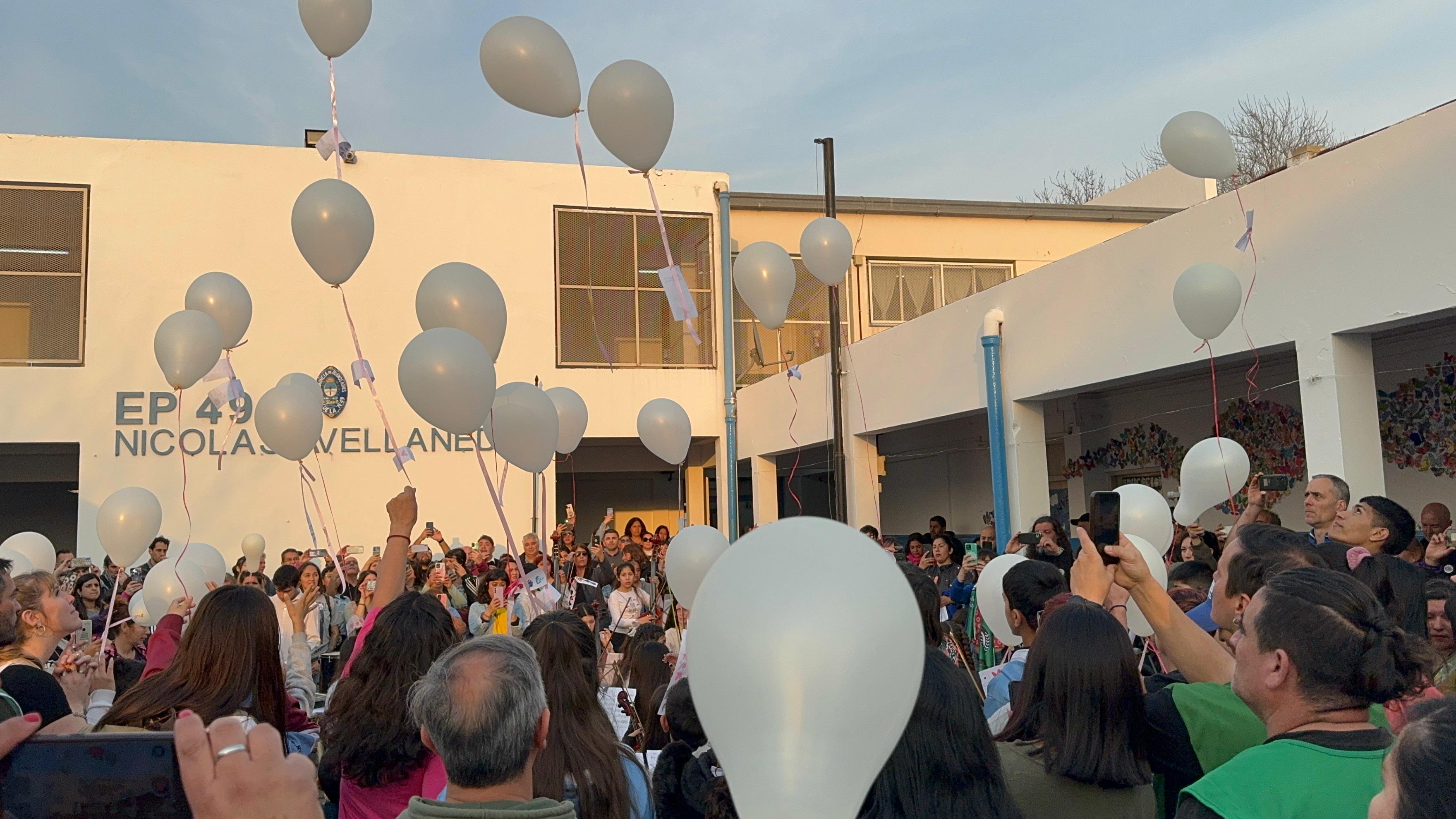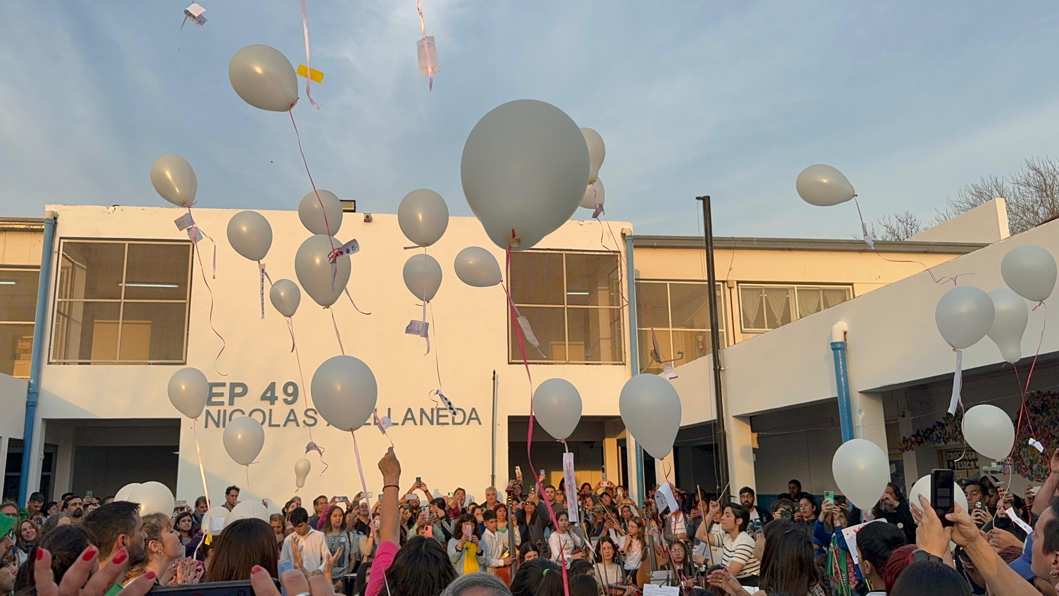 También tomaron la palabra Diego Rodríguez, hermano de Rubén; Hernán Pustilnik, Docente de la EP Nº 49, y Emmanuel Fernández, Presidente del Concejo Deliberante de Moreno. El acto en la Escuela continuó con el descubrimiento de una placa conmemorativa en recuerdo de Sandra y Rubén, y de una intervención artística con mariposas en el patio interno que realizó Alejandra Calamano, hermana de Sandra, con la ayuda de Docentes y la Comunidad Educativa. El cierre del acto se dio con otras interpretaciones de la Orquesta y una suelta de globos con mensajes emotivos.