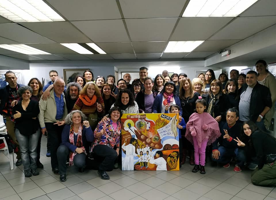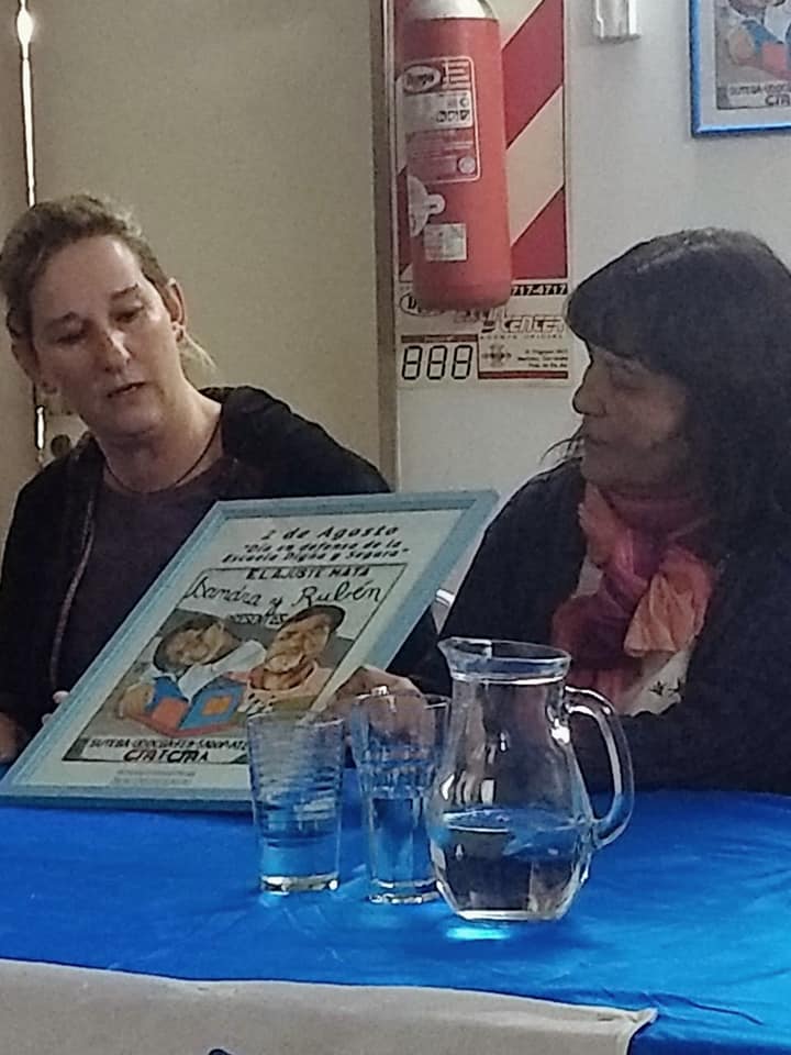 Posteriormente, Hilda Cabrera, Secretaria General de la CTA Avellaneda, hizo entrega de tres copias del mural en homenaje a Sandra y Rubén; una para la Seccional del SUTEBA Moreno y las restantes para las familias de Sandra y de Rubén. Vale recordar que Cabrera fue quien el año pasado coordinó la reunión que se realizó desde el Frente de Unidad Docente de Avellaneda con todo el bloque PJ-Unidad Ciudadana para la entrega del relevamiento distrital de infraestructura escolar, en el marco del Carpetazo realizado por el Frente de Unidad Docente Bonaerense en toda la provincia, y también presentó el proyecto de ordenanza por el que se terminó declarando en Avellaneda al 2 de agosto como "Día en defensa de la Escuela Pública digna y segura".