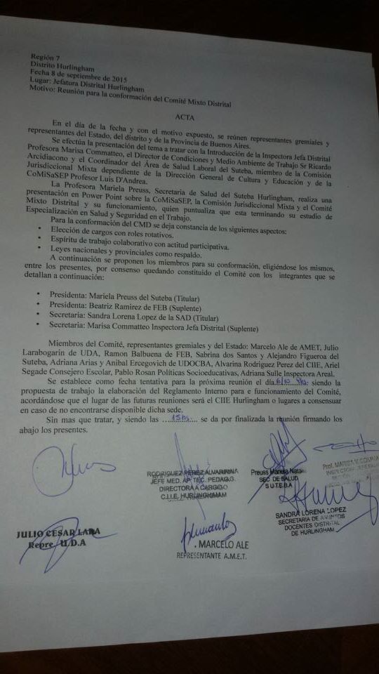 Impulsado desde el Suteba, el día martes 8 de septiembre de 2015, se firmó el acta constitutiva del Comité con miembros representantes del Estado (Inspectora Jefa Distrital, Inspectores Areales, Secretaria de Inspección, Directora del CIIE, Consejero Escolar, Director de Políticas Socioeducativas, Director de la DPI) y representantes de los trabajadores (integrado por los gremios AMET, FEB, SUTEBA y UDA).