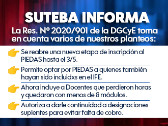 Al respecto, la nueva Resolución Nº 901 de la DGCyE tuvo en cuenta los planteos que se realizaron desde nuestra Organización Sindical sobre el PIEDAS, programa que se prorrogará hasta el 31 de mayo.