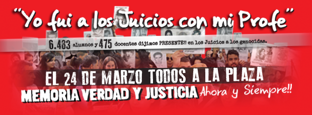 Desde el SUTEBA seguimos redoblando los esfuerzos para que la escuela sea un lugar en el que confluyan estas experiencias de vida. En relación a los últimos juicios contra civiles que fueron cómplices de la dictadura, Merlos expresó: "Lamentamos ver como quedaron sin ser juzgados personajes como Vicente Masot del diario La Nueva Provincia de Bahía Blanca; Carlos Blaquier, responsable y cómplice del secuestro y desaparición de trabajadores en el Ingenio Ledesma Tucumán; o los involucrados en la causa Papel Prensa (Bartolomé Mitre, Ernestina Herrera de Noble, Héctor Magnetto). Situaciones que nos ponen en alerta. Es así como un lugar para analizar estos hechos es la escuela. Los chicos y los profes que transitan día a día la escuela deben tener la posibilidad de conocer la verdad. De esta manera podremos garantizar que las futuras generaciones exijan justicia y que los genocidas y sus cómplices civiles sean encarcelados. Es una tarea difícil, pero estamos convencidos que la escuela es un espacio fundamental para dar esta batalla".