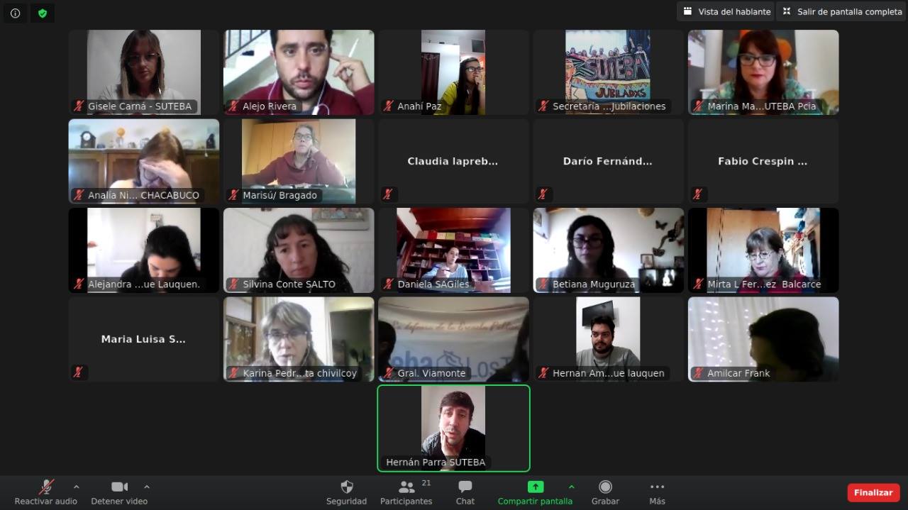 En el día de hoy, desde temprano, la Secretaría de Jubilaciones del SUTEBA compartió una nueva reunión de Secretarixs y Equipos de Jubilaciones, con lxs compañerxs de los distritos de: Bragado, Pehuajó, Rivadavia, Trenque Lauquen, Los Toldos, Viamonte, Chacabuco, Chivilcoy, Lincoln, Salto, Balcarce, San Andrés de Giles y Adolfo Alsina.