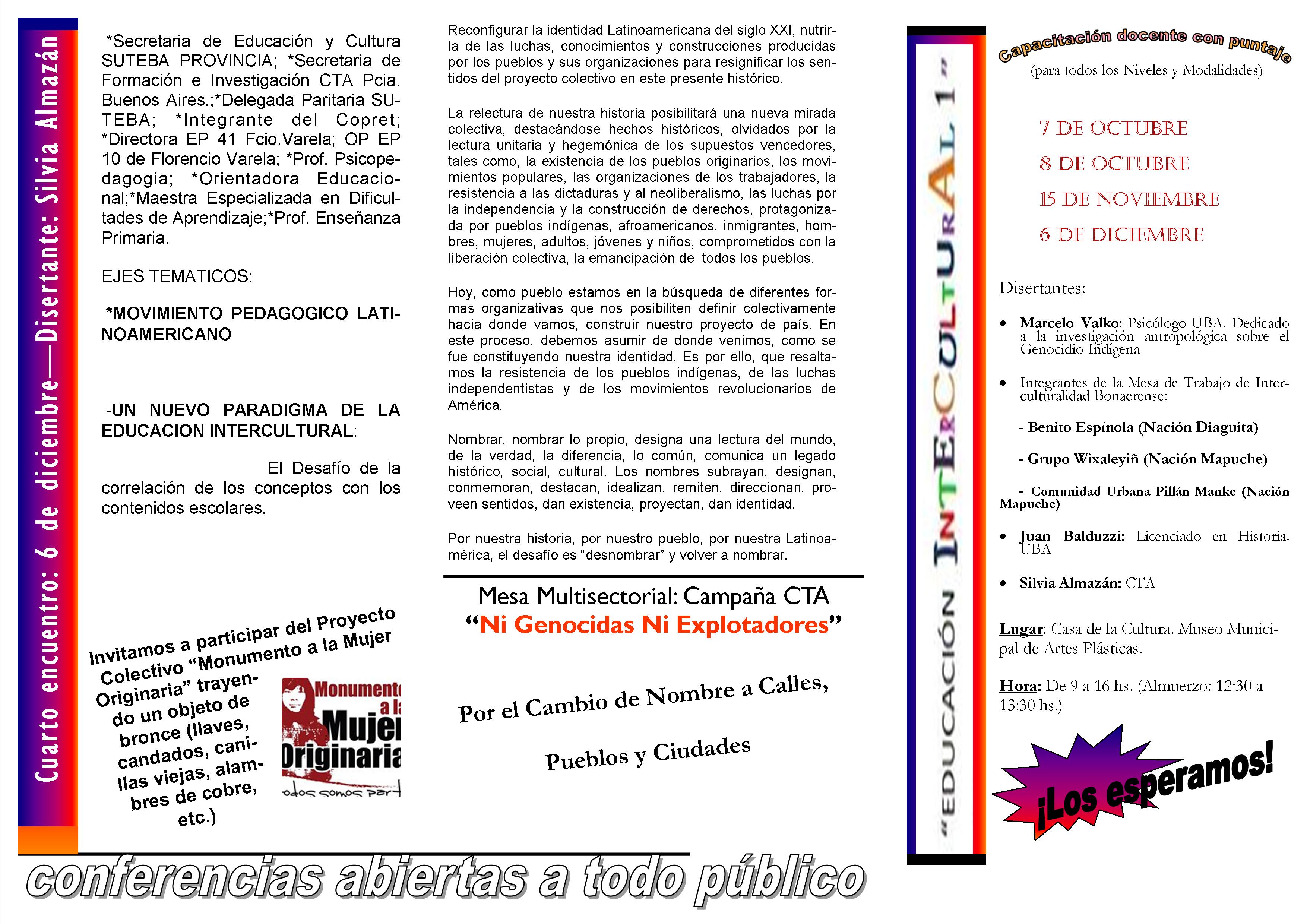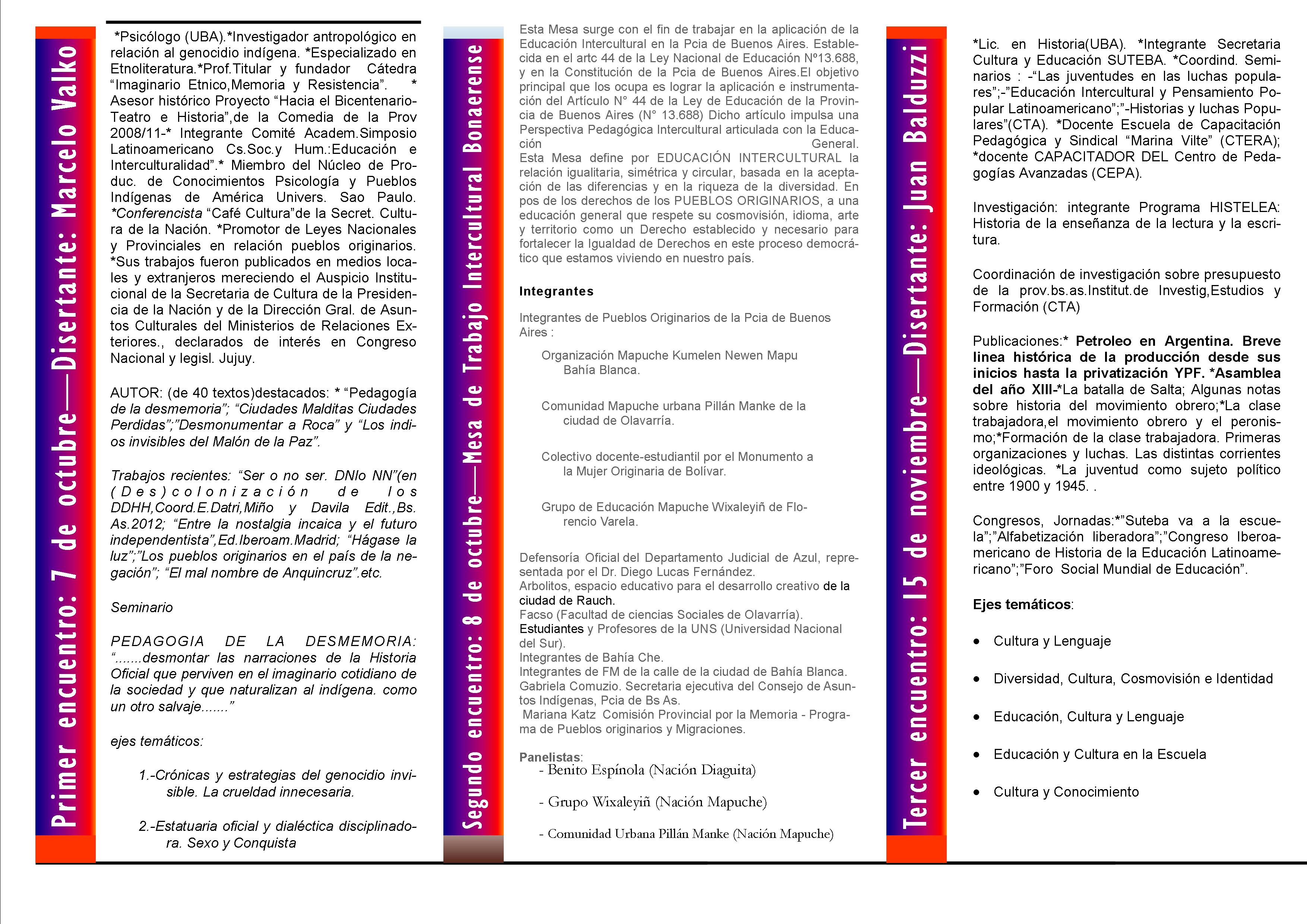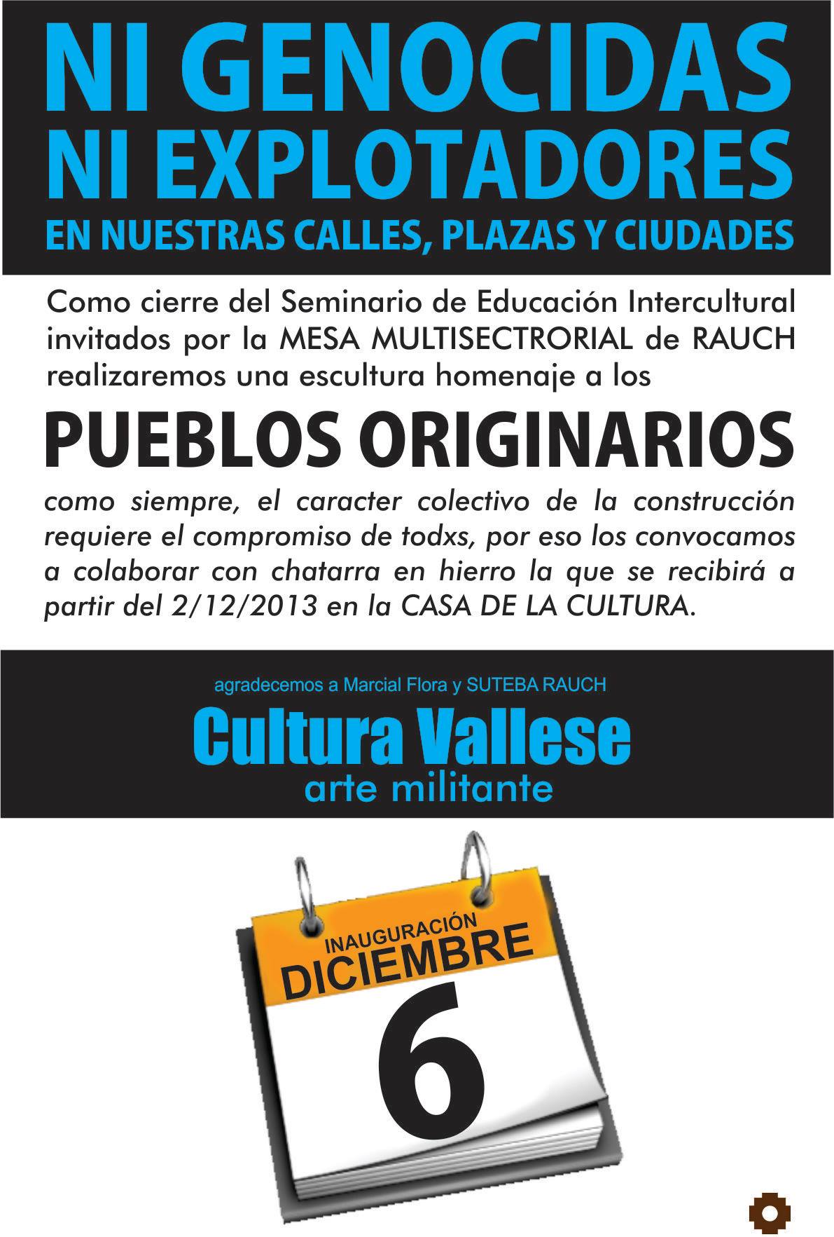 El Primer Seminario de "Educación Intercultural" se desarrollará a partir del 7 de ocubre en la Casa de la Cultura Museo Municipal de Artes Plásticas (Rauch), entre las 9 y las 16 horas. Durante el seminario se trabajará bajo la consigna "Ni Genocidas, Ni Explotadores".