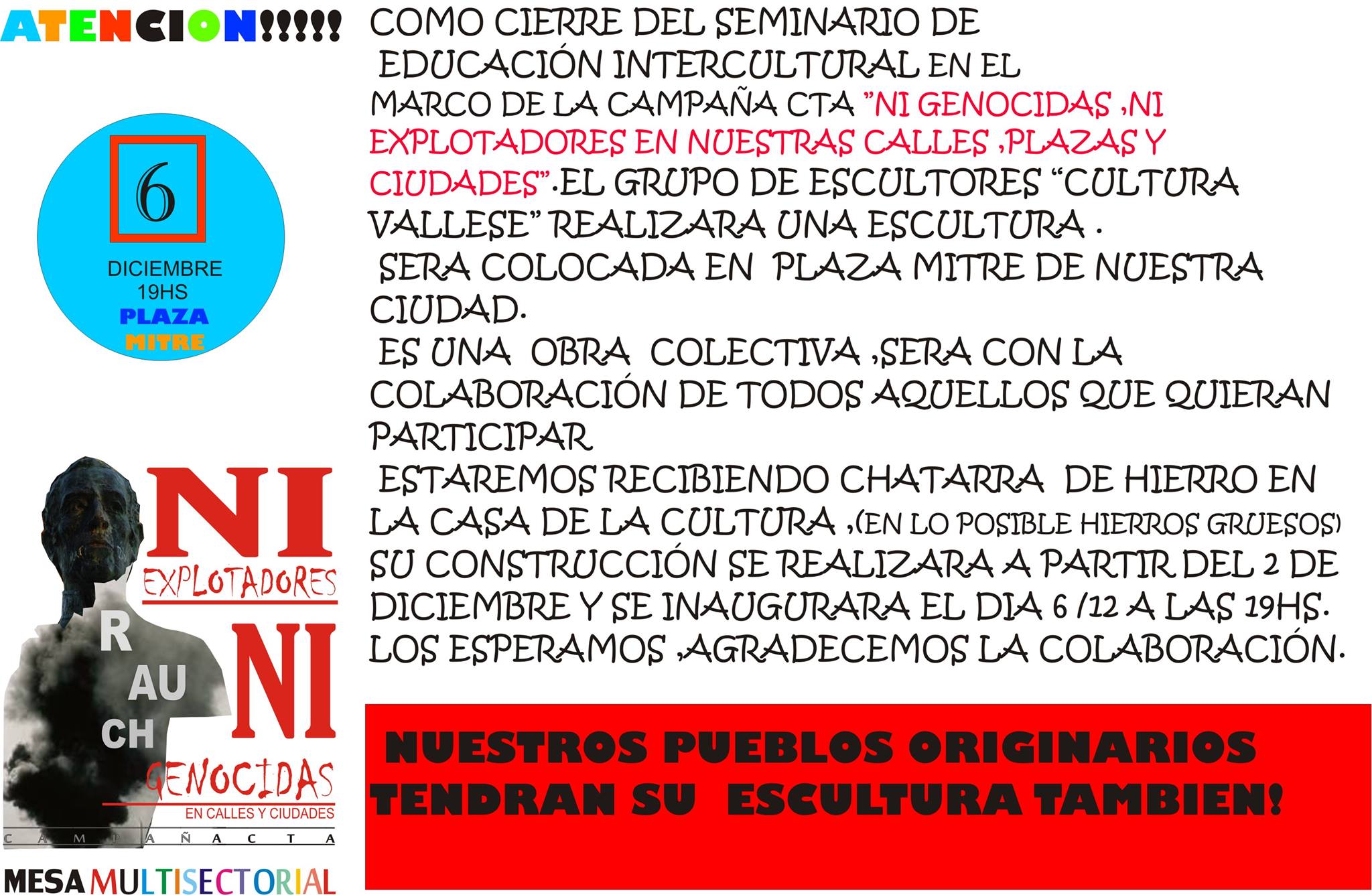 Como cierre del Seminario de Educación Intercultural, el día 6 de Diciembre, invitados por la MESA MULTISECTORIAL de RAUCH, realizaremos una escultura homenaje a los PUEBLOS ORIGINARIOS.