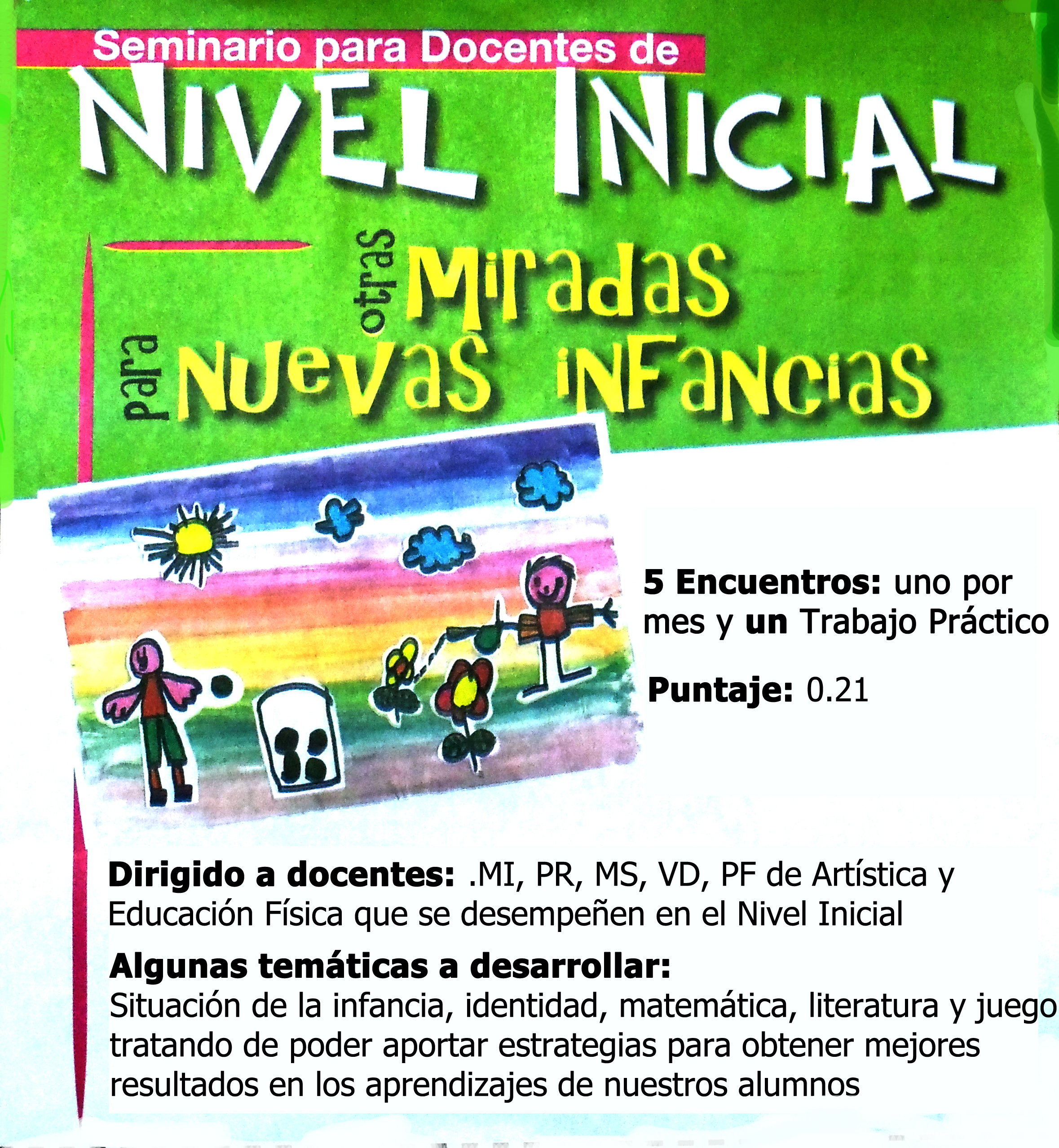 La Secretaria de Cultura del SUTEBA Seccional La Plata, en el marco del acompañamiento permanente de nuestro sindicato a los Trabajadores de la Educación del Distrito, invita a todos los docentes que se desempeñen en el Nivel Inicial (MI, PR, MS, D, VD, PF de Artística y Educación Física, EOE) al Seminario: Otras miradas para nuevas infancias». El mismo constará de 5 encuentros y otorgará un puntaje de 0.21 y tiene justificación de inasistencia (Art. 115-c2). Los Encuentros tendrán una frecuencia mensual y se realizarán en nuestra Sede Gremial. Algunos de los temas a tratar serán: