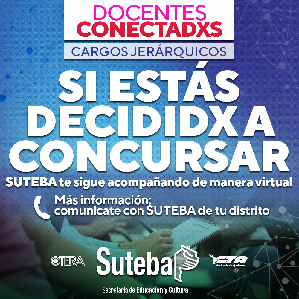 Si estás decididx e interesadx en ocupar un puesto de trabajo en conducción (Inspectorxs, Directorxs, Regentes, Jefxs de área y/o Secretarixs), desde el SUTEBA vamos a seguir acompañándote de manera online (DOCENTES CONECTADXS) con diferentes propuestas de formación; para que logres acceder fortalecidx y con mayores herramientas a esos puestos de trabajo.
