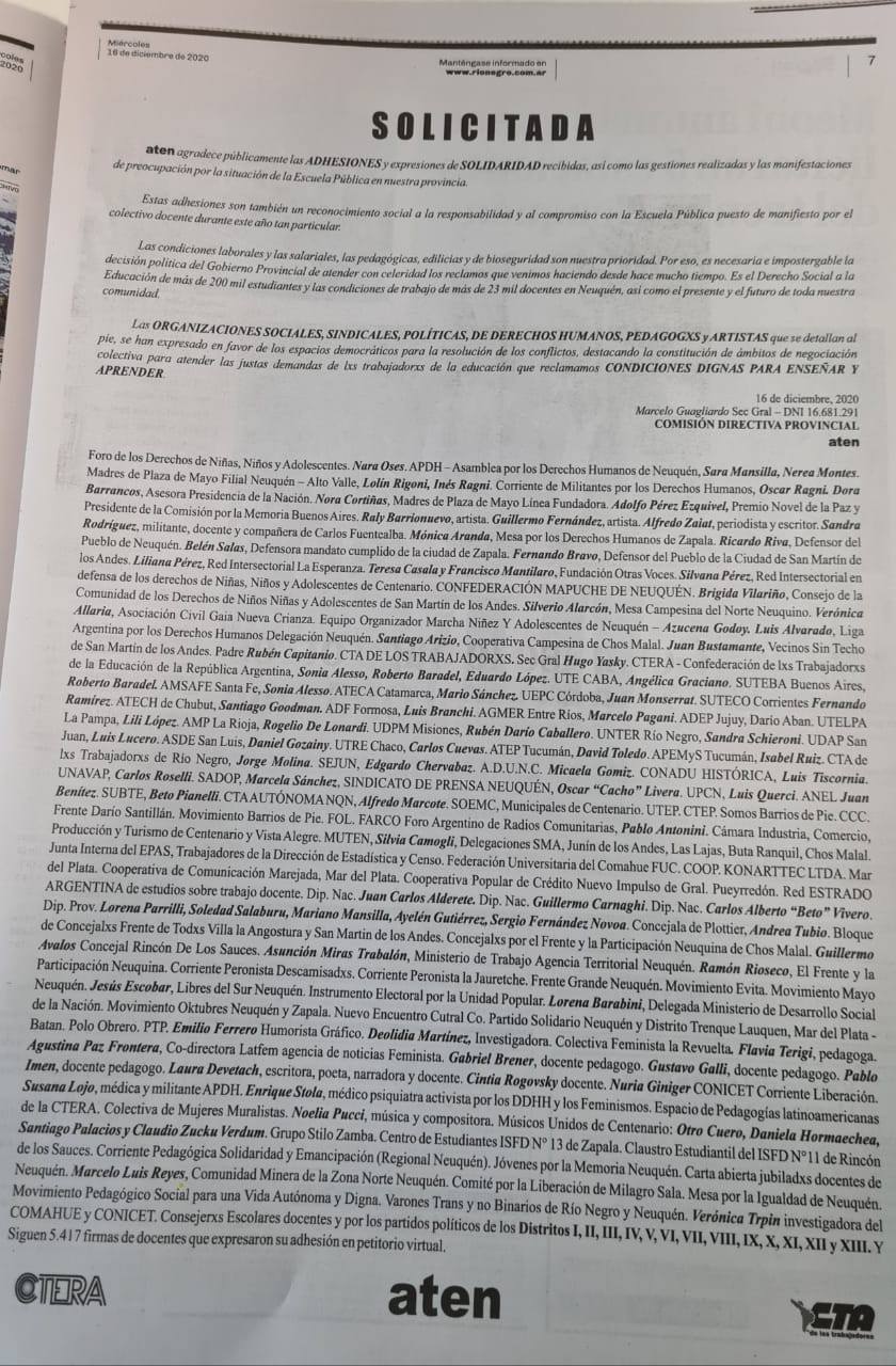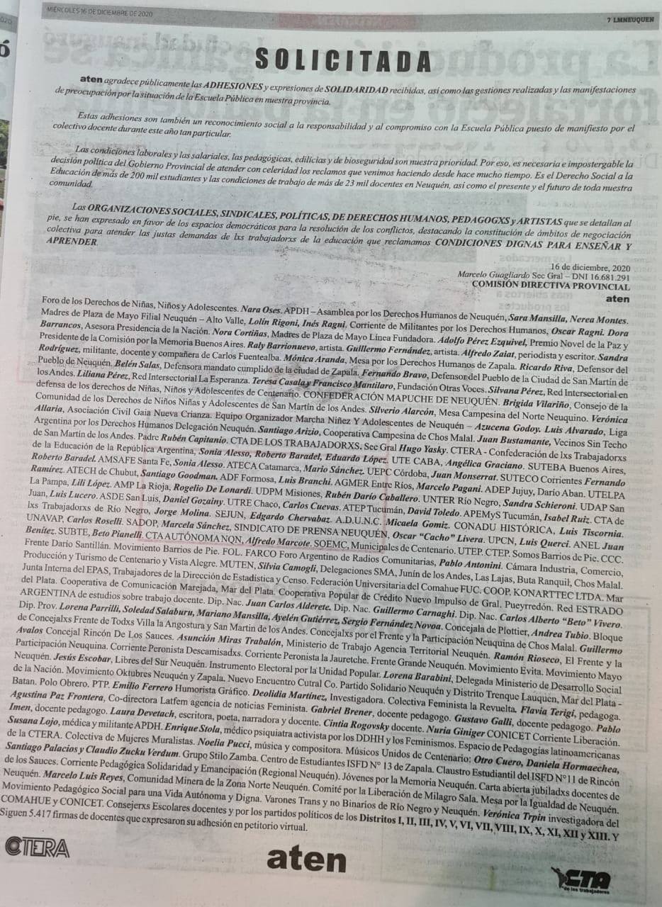 ATEN agradece públicamente las ADHESIONES y expresiones de SOLIDARIDAD recibidas, así como las gestiones realizadas y las manifestaciones de preocupación por la situación de la Escuela Pública en nuestra Provincia.