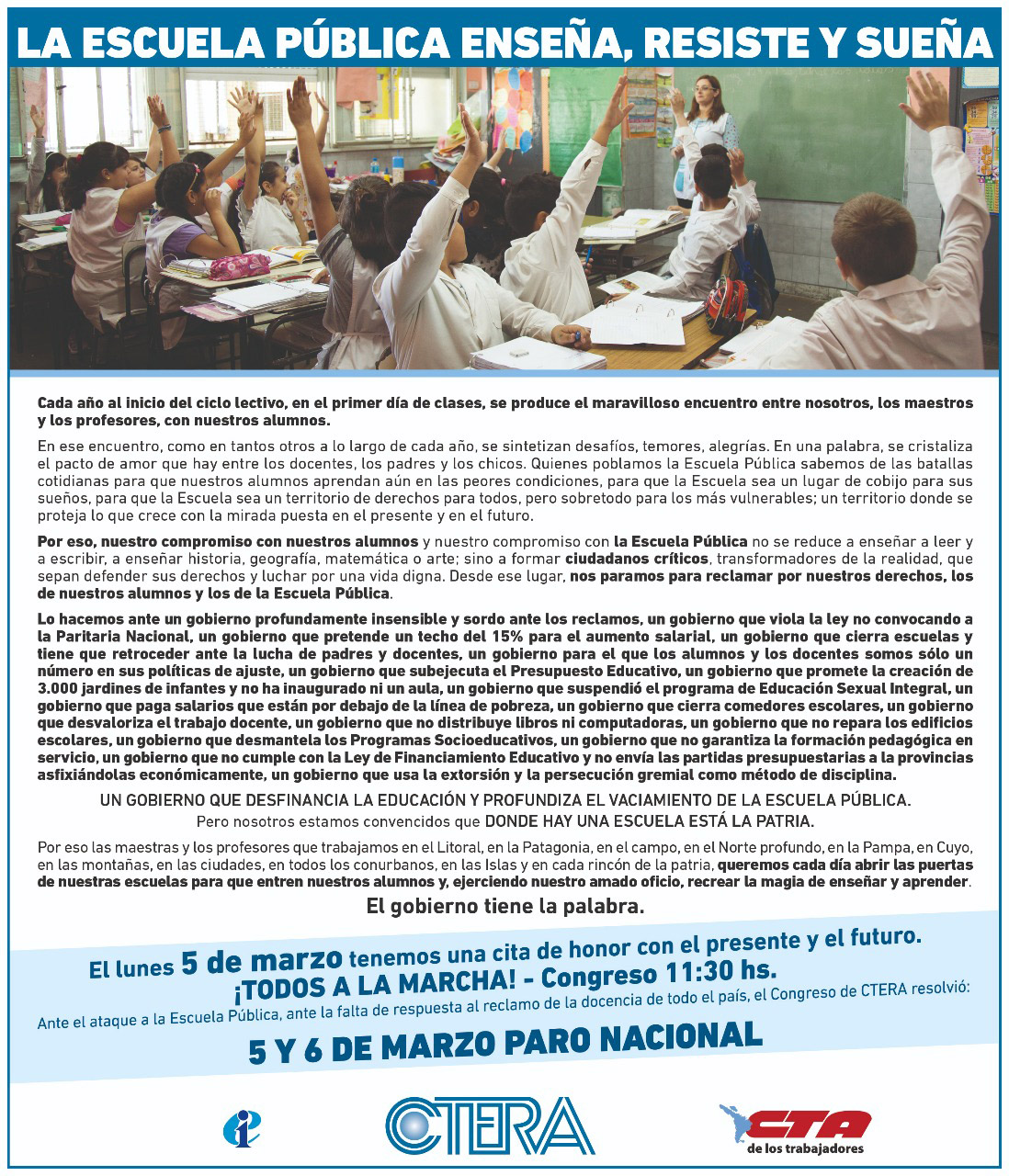 Lo hacemos ante un gobierno profundamente insensible y sordo ante los reclamos, un gobierno que viola la ley no convocando a la Paritaria Nacional, un gobierno que pretende un techo del 15% para el aumento salarial, un gobierno que cierra escuelas y tiene que retroceder ante la lucha de padres y docentes, un gobierno para el que los alumnos y los docentes somos sólo un número en sus políticas de ajuste, un gobierno que subejecuta el Presupuesto Educativo, un gobierno que promete la creación de 3.000 jardines de infantes y no ha inaugurado ni un aula, un gobierno que suspendió el programa de Educación Sexual Integral, un gobierno que paga salarios que están por debajo de la línea de pobreza, un gobierno que cierra comedores escolares, un gobierno que desvaloriza el trabajo docente, un gobierno que no distribuye libros ni computadoras, un gobierno que no repara los edificios escolares, un gobierno que desmantela los Programas Socioeducativos, un gobierno que no garantiza la formación pedagógica en servicio, un gobierno que no cumple con la Ley de Financiamiento Educativo y no envía las partidas presupuestarias a la provincias asfixiándolas económicamente, un gobierno que usa la extorsión y la persecución gremial como método de disciplina.
