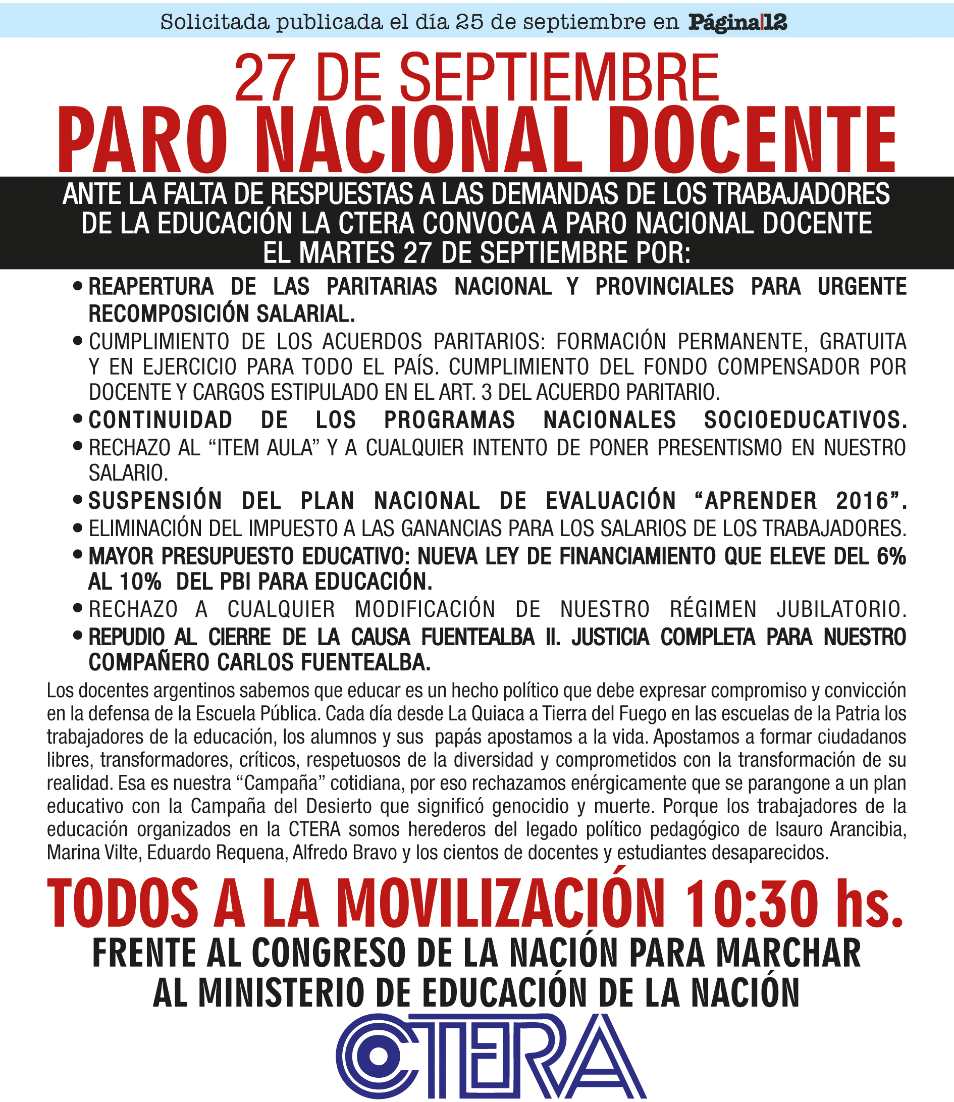 ANTE LA FALTA DE RESPUESTAS A LAS DEMANDAS DE LOS TRABAJADORES DE LA EDUCACIÓN LA CTERA CONVOCA A PARO NACIONAL DOCENTE EL MARTES 27 DE SEPTIEMBRE POR: