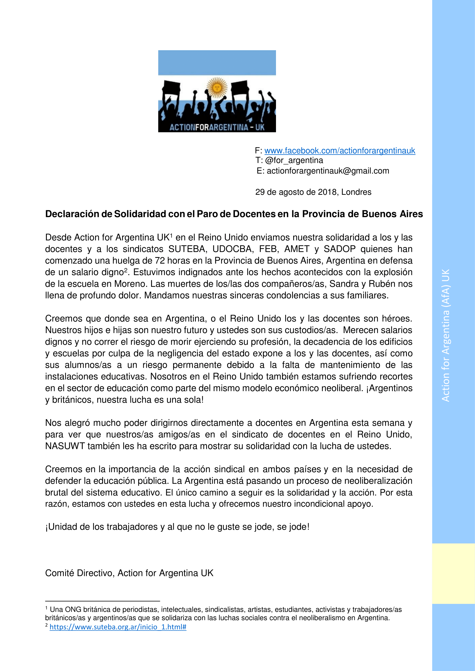 Les escribo en nombre del NASUWT para expresar nuestra solidaridad con los Trabajadores Docentes en Buenos Aires que van a realizar tres días de huelga esta semana, luchando por Escuelas seguras y salarios dignos. Estamos con ustedes en la lucha en defensa de la Educación Pública.