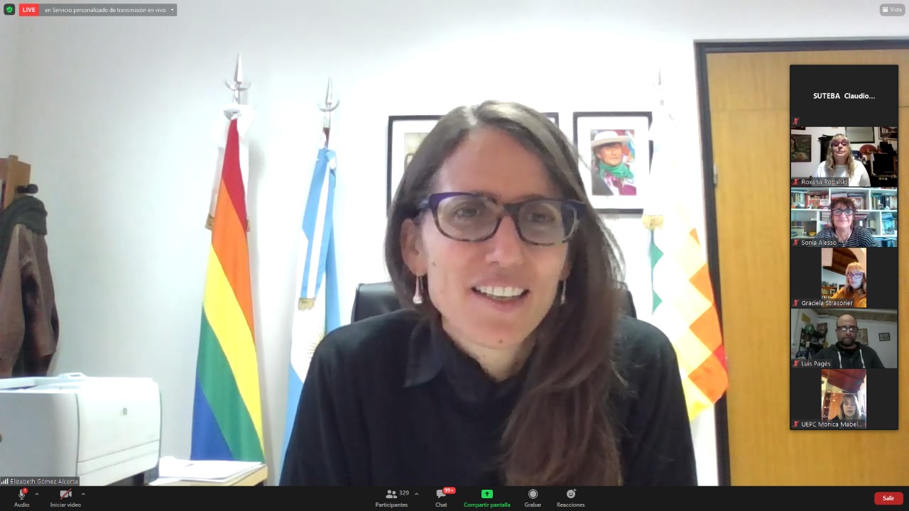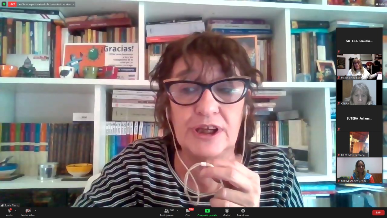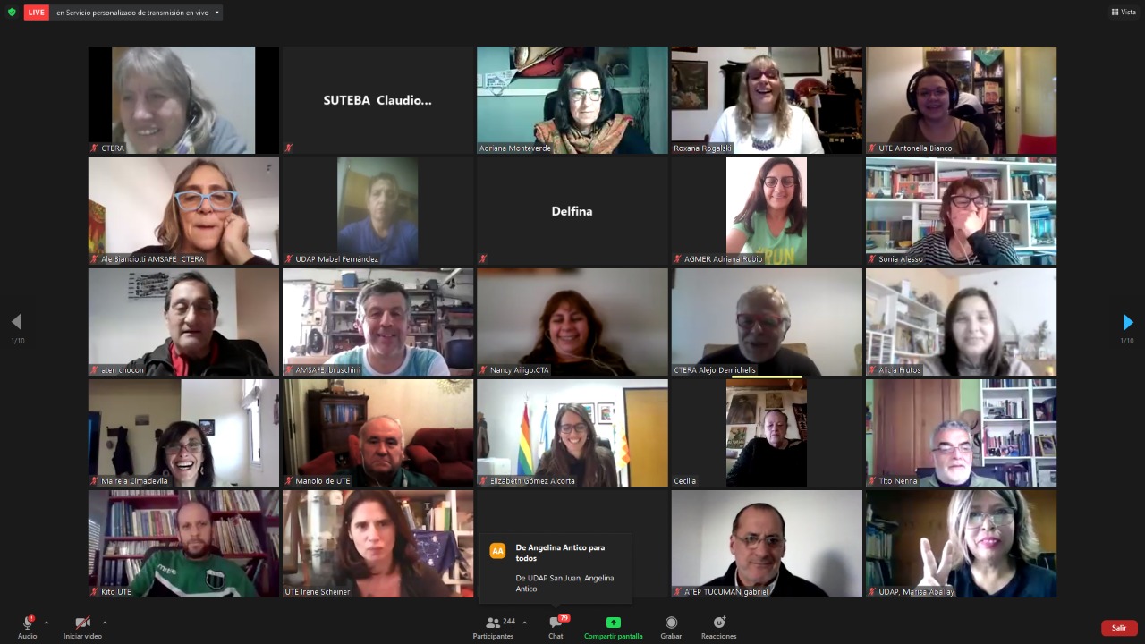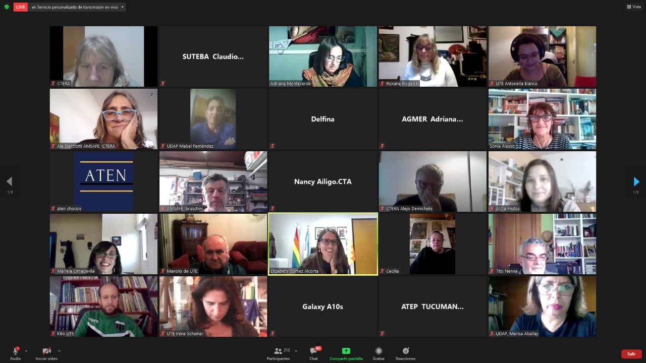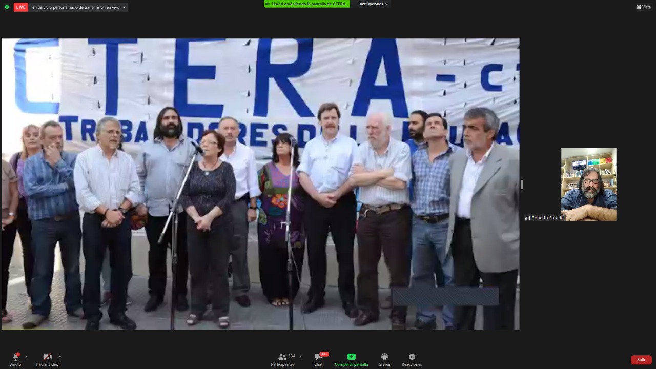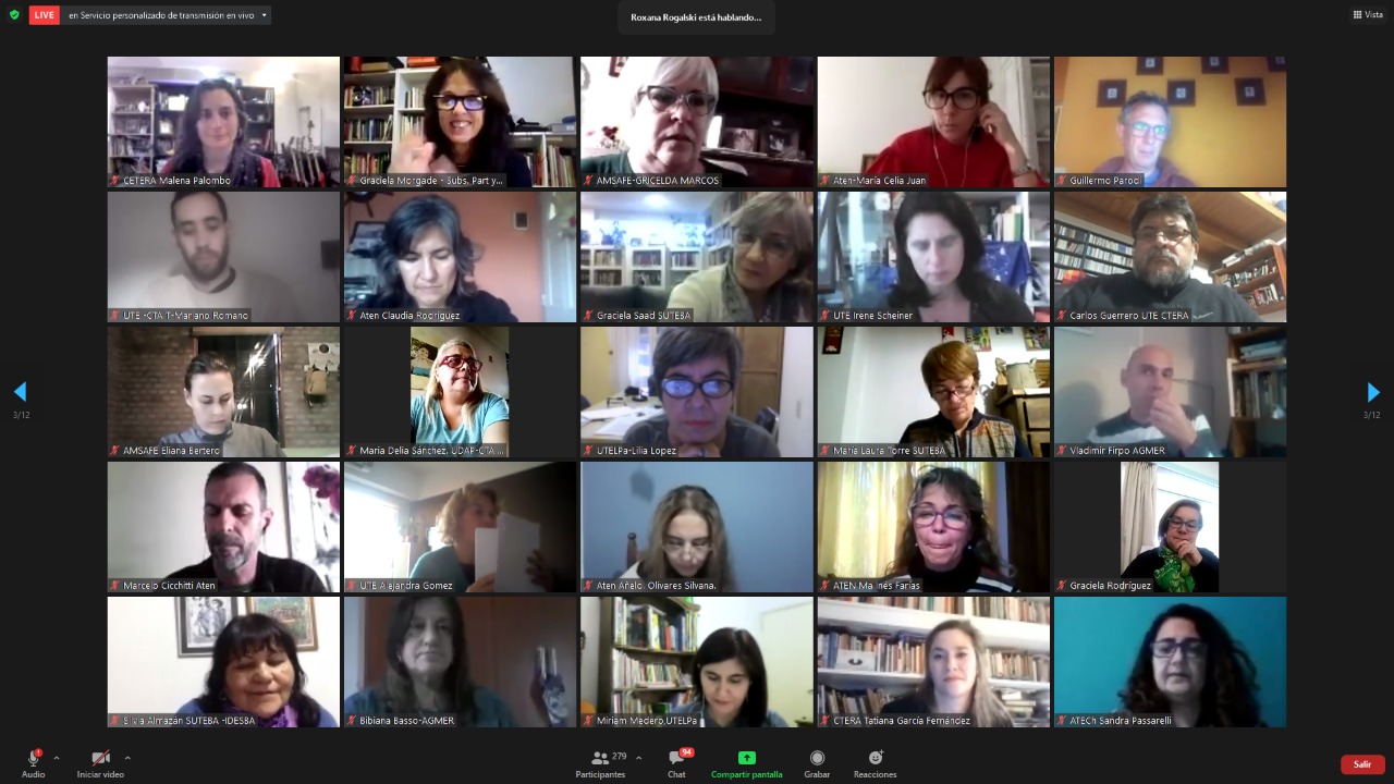 El encuentro contó con la participación de Hugo Yasky, Secretario General de la CTA de lxs Trabajadorxs y Presidente del Comité Regional de la Internacional de América Latina; Sonia Alesso, Secretaria General de la CTERA y miembro del Comité Ejecutivo Mundial de la IE por América Latina; Roberto Baradel, Secretario General del SUTEBA y Secretario General Adjunto de la CTERA; Elizabeth Gómez Alcorta, Ministra de las Mujeres, Géneros y Diversidad (MMGD) de la Nación; Fátima Silva, Vicepresidenta del Comité Regional de la Internacional de la Educación de América Latina; actuando como moderadora Roxana Rogalski, Secretaria de Género e Igualdad de Oportunidades de CTERA.