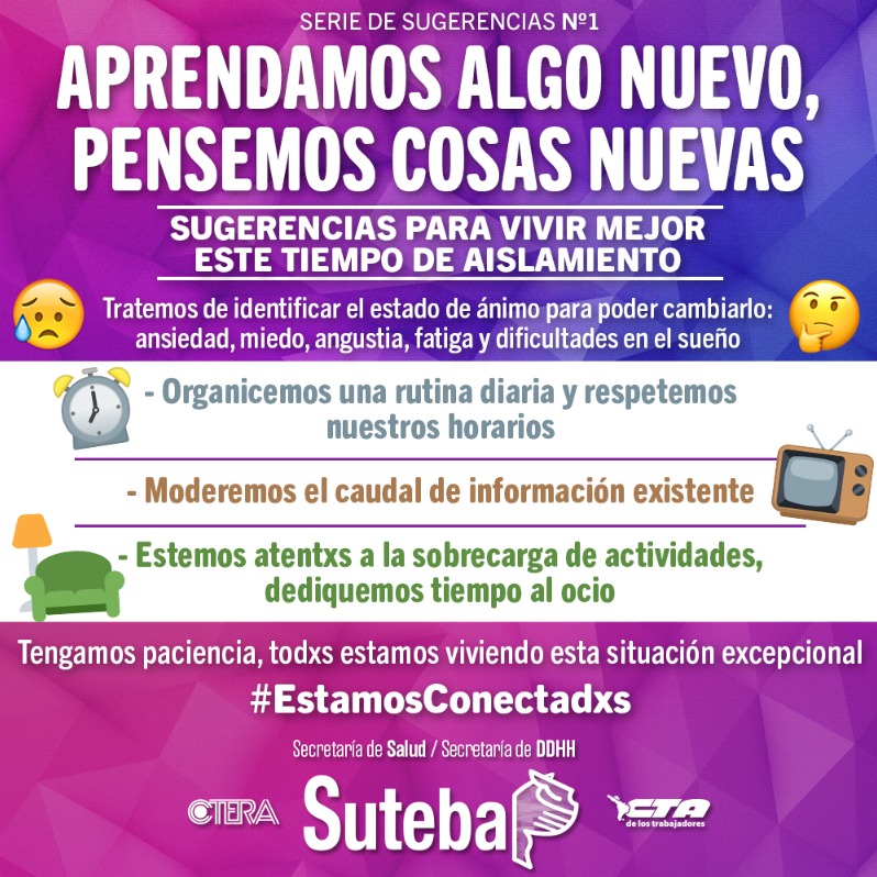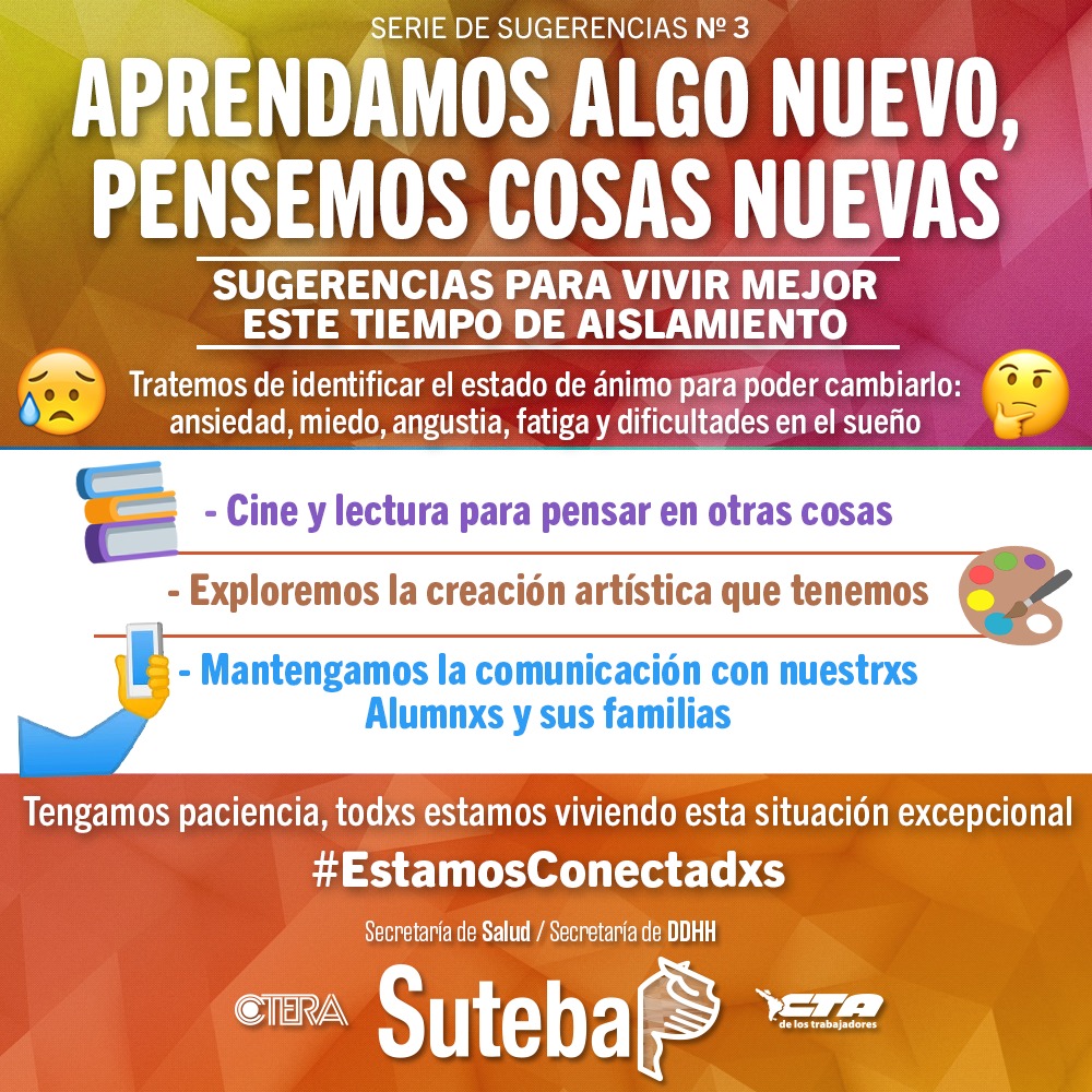 La necesidad de quedarse en casa puede producir momentos de ansiedad, miedo, angustia, tristeza, sensación de encierro, aburrimiento, hastío, enojo, frustración, fatiga, insomnio o ganas de dormir. No hay que asustarse, ¡nos pasa a todxs! Tratemos de identificar ese estado de ánimo, así podemos hacer algo para cambiarlo.
