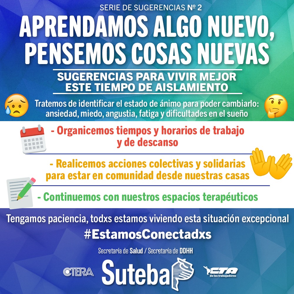 Lxs Trabajadorxs de la Salud mental siguen acompañando por teléfono o videoconferencia. No suspendamos la terapia que estamos haciendo. Hay procesos que convienen continuarlos. Tengamos en cuenta que podemos pedir ayuda e iniciar un tratamiento aún en estas condiciones.