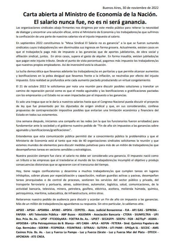 "La idea de este proyecto parte del concepto ‘el salario no es ganancia’. Viene a darle transparencia y claridad a la determinación del mínimo no imponible. Se busca establecer que el mínimo sea a partir de 10 salarios mínimos vitales y móviles o 5 canastas familiares", afirmó por su parte Palazzo, Secretario General de la Asociación Bancaria.