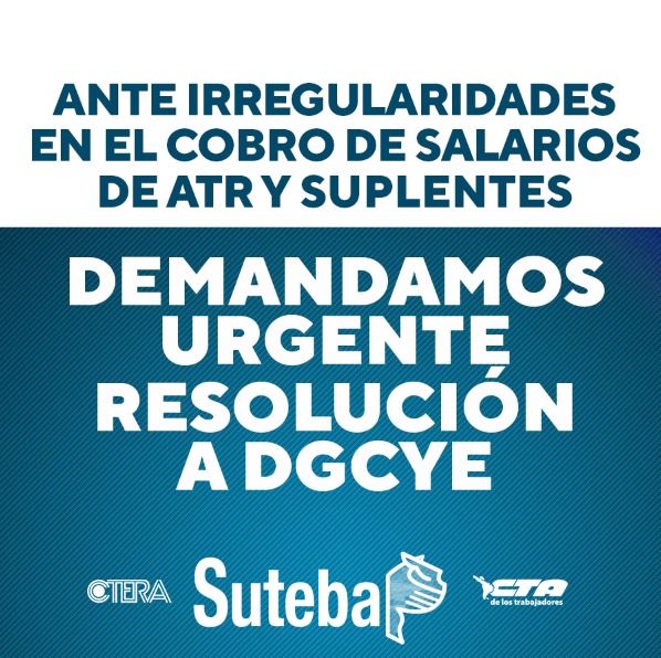 Ante situaciones de irregularidades en el cobro de salarios, no cobros de ATR y suplentes, el SUTEBA reclama a la DGCyE la urgente normalización de la percepción salarial, un derecho fundamental de lxs Trabajadorxs de la Educación.