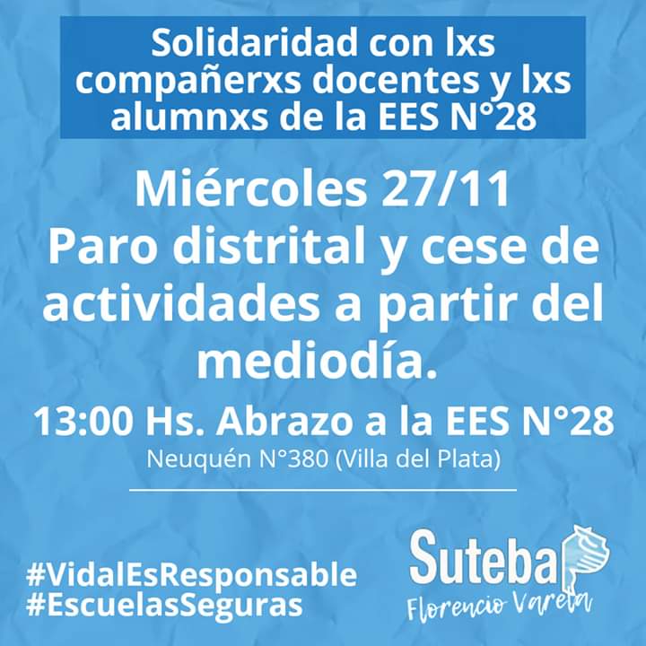Por lo tanto, expresamos nuestro total respaldo al abrazo a la mencionada Escuela (Neuquén 380, Florencio Varela) a partir de las 13 hs, y a la convocatoria al Paro Distrital y al cese de actividades a partir del mediodía que se realizarán en el día de hoy.