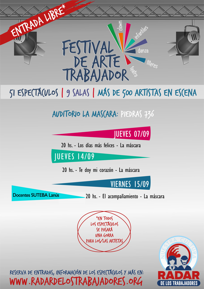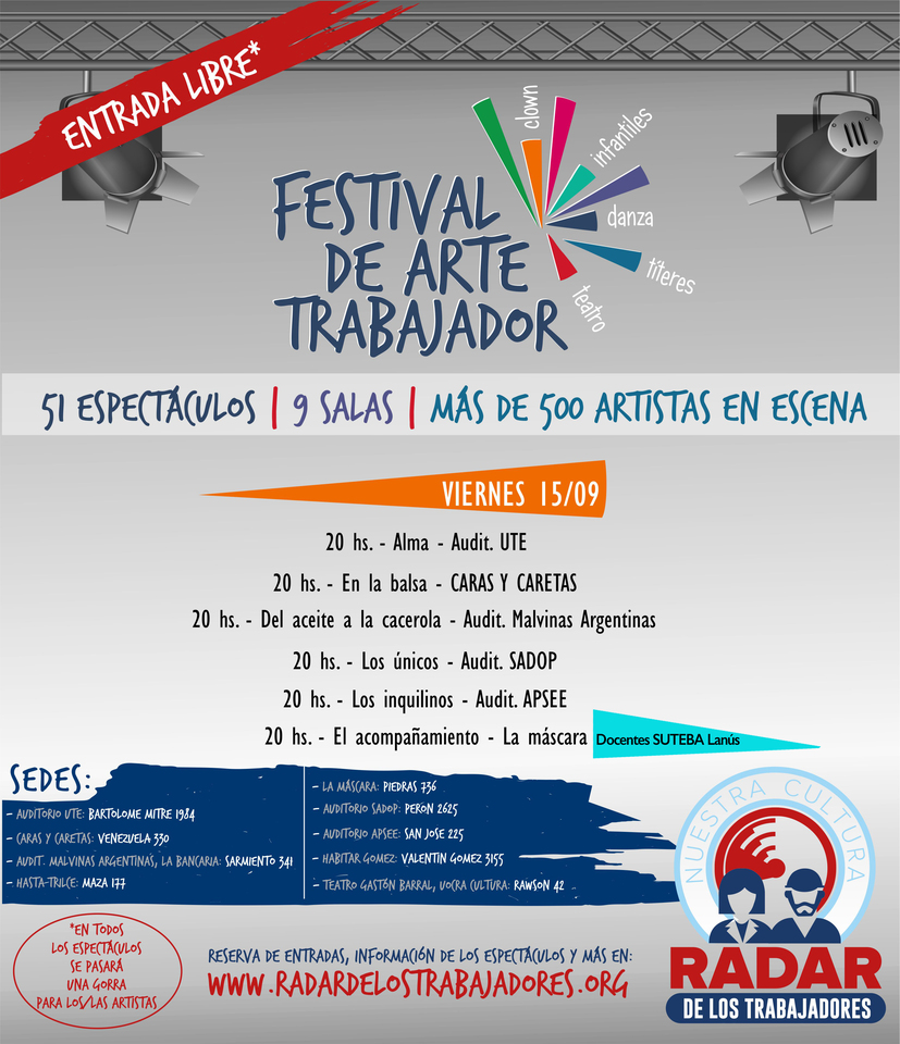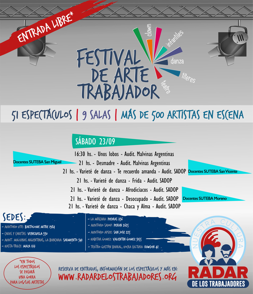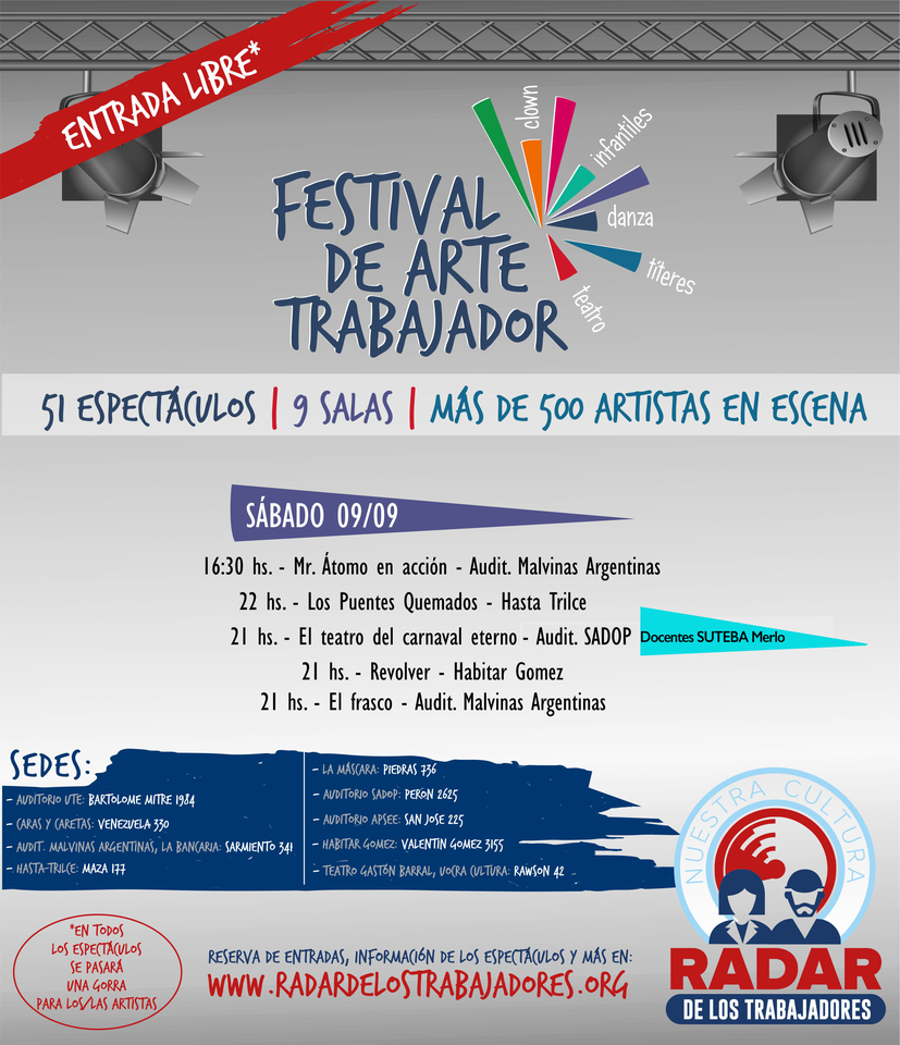 El sábado 2 de septiembre comenzó el Festival de Arte Trabajador, organizado por Radar de los Trabajadores y que cuenta con la participación del SUTEBA. Se desarrollará hasta fin de mes en nueve salas distintas con 51 espectáculos y más de 500 artistas.