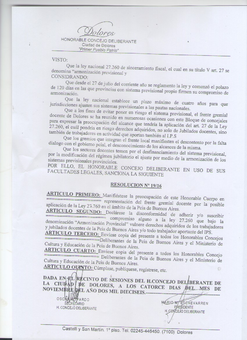 El día 14 de noviembre el HCD de Dolores, en forma unánime, se manifestó en contra de la Armonización del IPS de la provincia de Buenos Aires con la Ley Nacional 27260/16, de reparación histórica, por significar un avance en la pérdida de derechos adquiridos por los Trabajadores de la Educación.