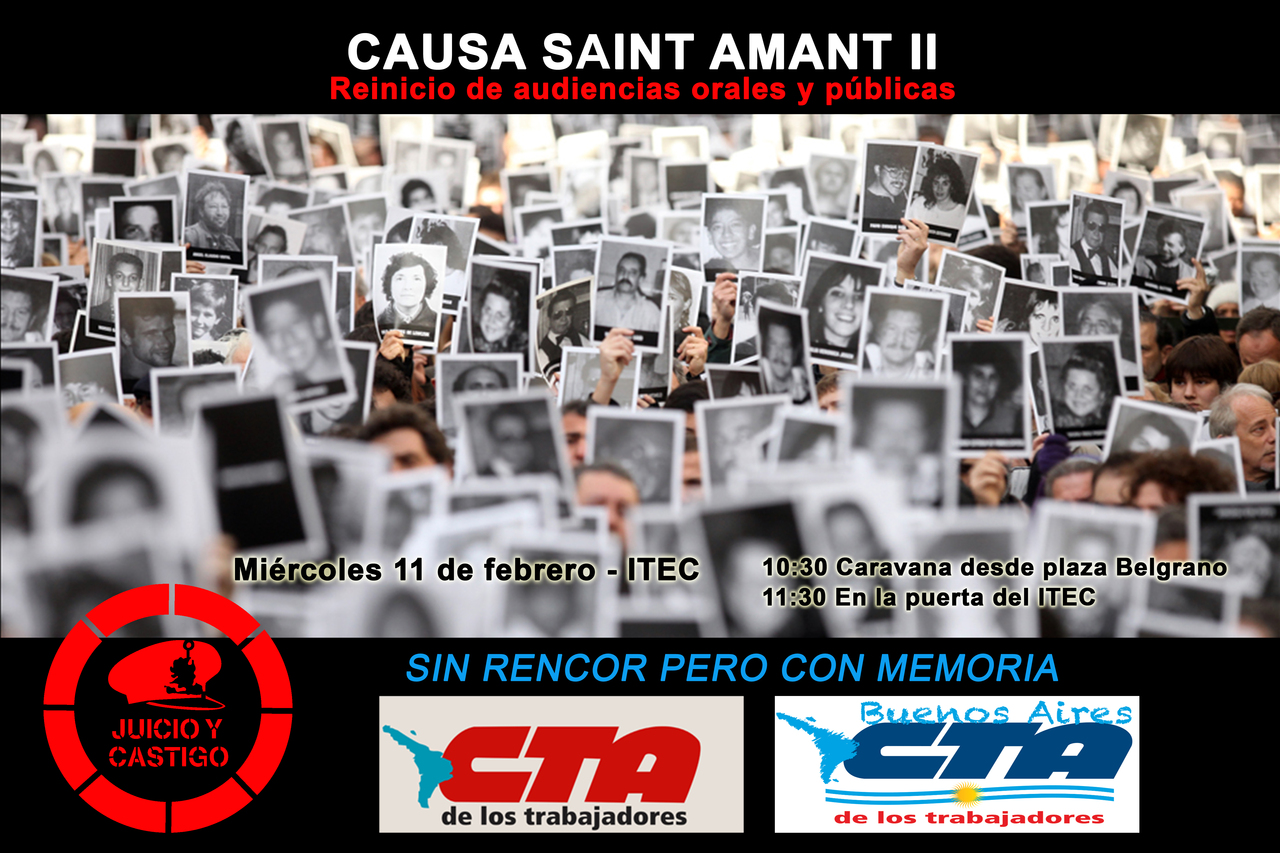 La CTA de los Trabajadores Regional San Nicolás - Ramallo invita a los compañeros al reinicio de las Audiencias Orales y Públicas por la Megacausa Saint Amant II para este miércoles 11 en la puerta del ITEC, con el objetivo de apoyar a los testigos y familiares. Es imprescindible llevar DNI y fotocopia para ingresar y presenciar el juicio.