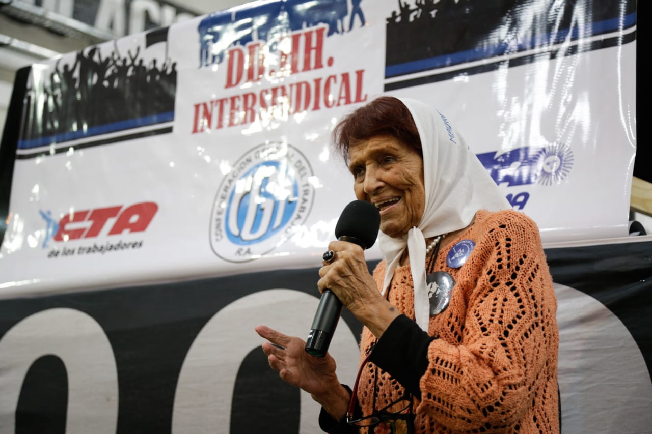 Al final de la jornada, con el cántico "Madres de la Plaza, el Pueblo las abraza" de todxs lxs presentes, se celebró la presencia de Taty Almeida, integrante de Madres de Plaza de Mayo - Línea Fundadora, quien dijo emocionada: "Es un placer estar acá, en este primer Encuentro Federal e Intersindical de Derechos Humanos: alienta, da fuerzas y esperanzas. Tenemos Memoria, una Memoria que nadie va a poder borrar mientras existan luchadorxs que den resistencia pacífica y que sigan reivindicando la Memoria, la Verdad y la Justicia. ¡Fuerza, no bajen los brazos y sigan luchando! Se lo decimos nosotras que, a pesar de todo, seguimos de pie".