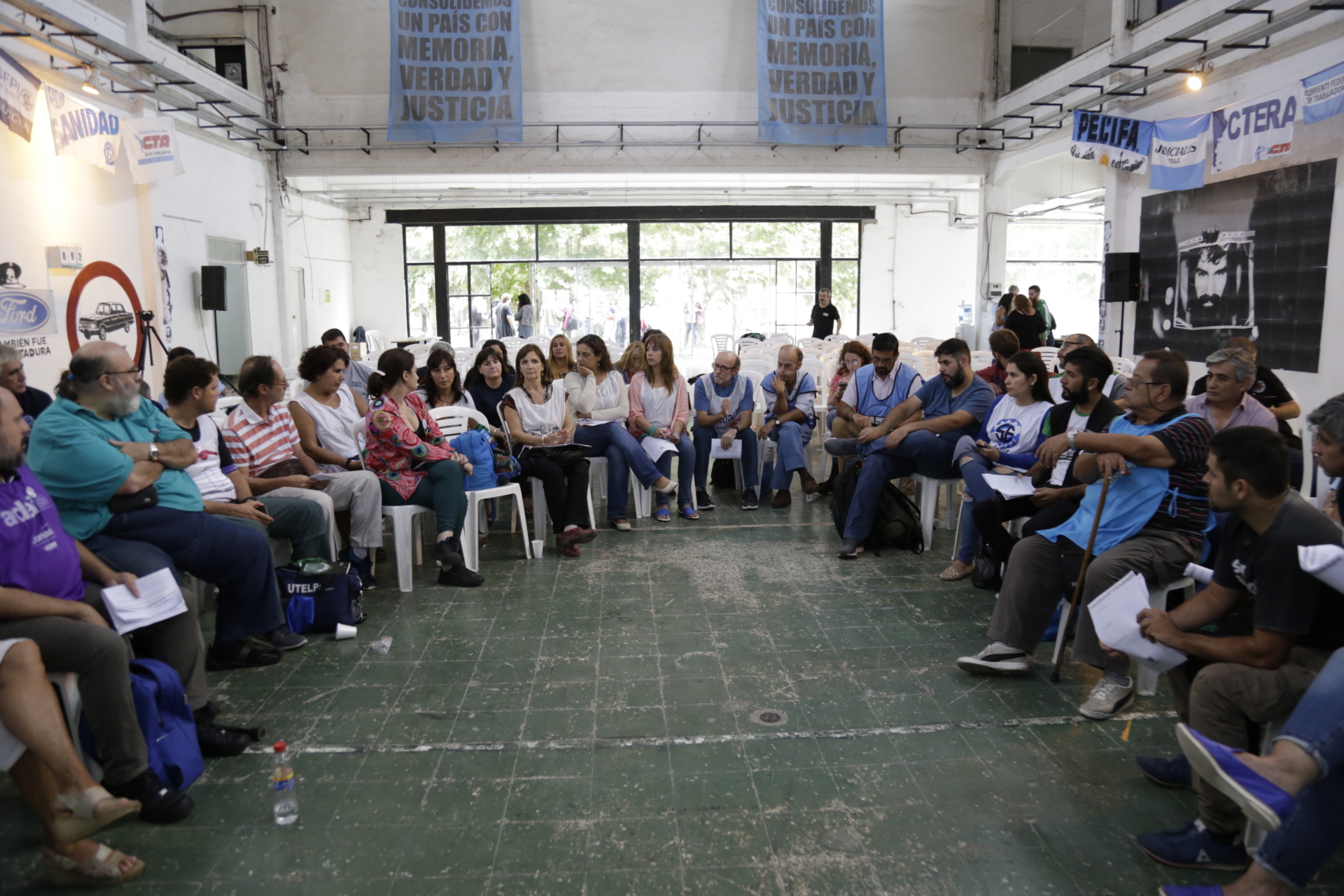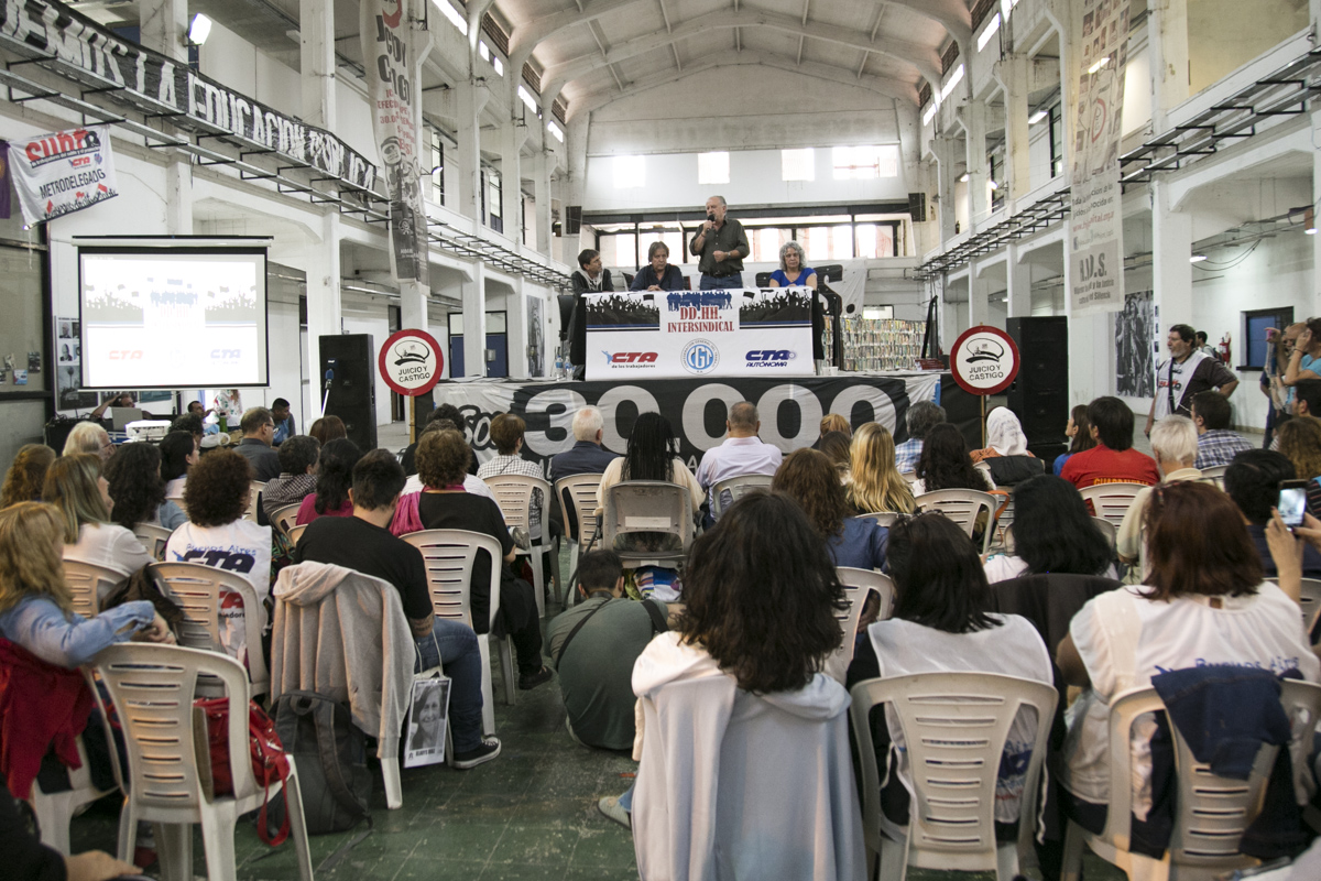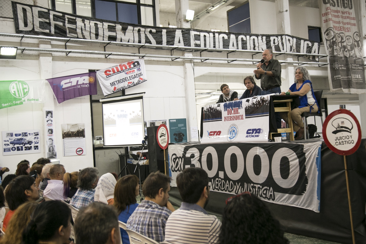 La presentación del encuentro estuvo a cargo de María Reigada, Secretaria de DDHH de CTA Provincia de Buenos Aires, y de Claudia Lázzaro, Secretaria de Género y DDHH del Sindicato de Obreros Curtidores. Gisele Tepper, integrante de H.I.J.O.S Capital, brindó unas palabras de bienvenida a la histórica jornada.