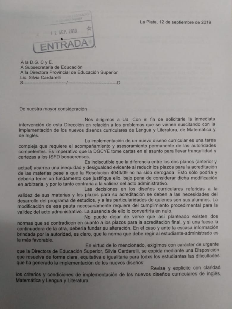 En relación a reiterados reclamos planteados por Docentes y Estudiantes de los Institutos de Formación Docente de Profesorados de Lengua y Literatura, Matemática e Inglés (en los que se implementaron nuevos diseños curriculares), desde el SUTEBA presentamos una nota solicitando la intervención de la Dirección de Educación Superior para que atienda las diferencias que existen en el régimen de correlatividades y los plazos de acreditación.