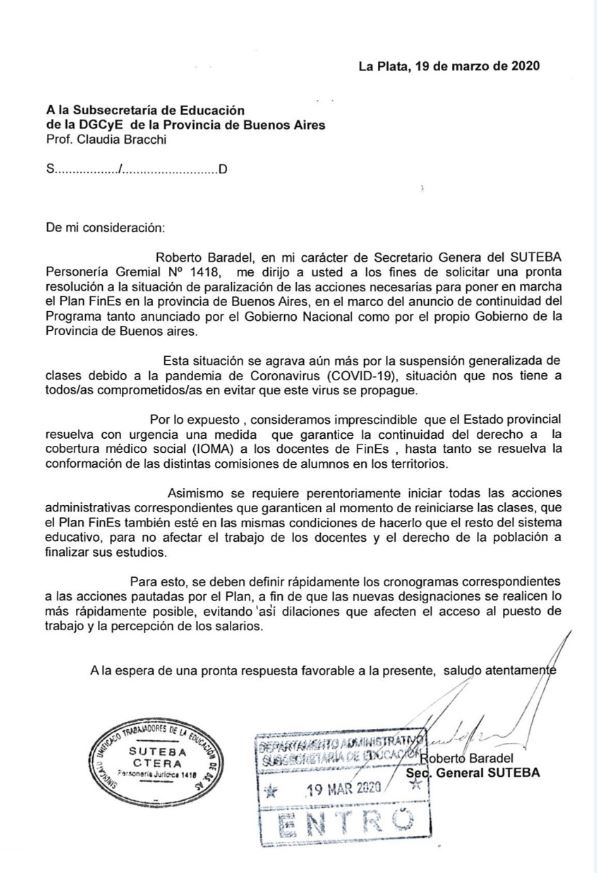 Ante la paralización del Programa Fines, ya explicitada en comunicados anteriores, agravada en este momento por la suspensión generalizada de clases por la pandemia de coronavirus; el SUTEBA está presentando un reclamo ante la Dirección General de Cultura y Educación, en resguardo del derecho al trabajo y la cobertura social de lxs Docentes del programa.