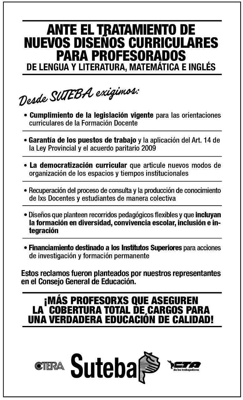 Ante el tratamiento de nuevos diseños curriculares para Profesorados de Lengua y Literatura, Matemática e Inglés, desde SUTEBA exigimos: