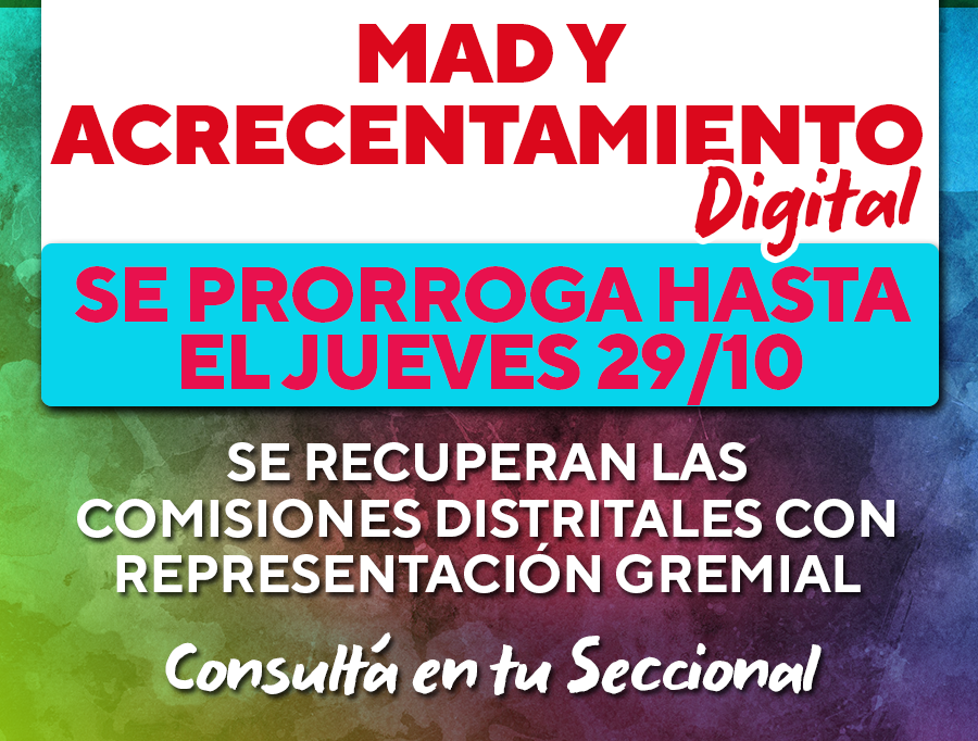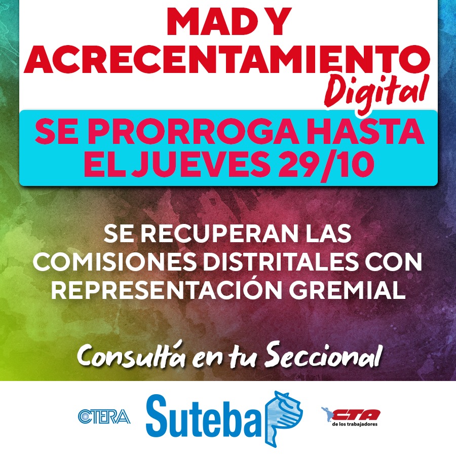 SUTEBA INFORMA: SE PRORROGA HASTA EL JUEVES 29/10 EL MAD Y ACRECENTAMIENTO DIGITAL