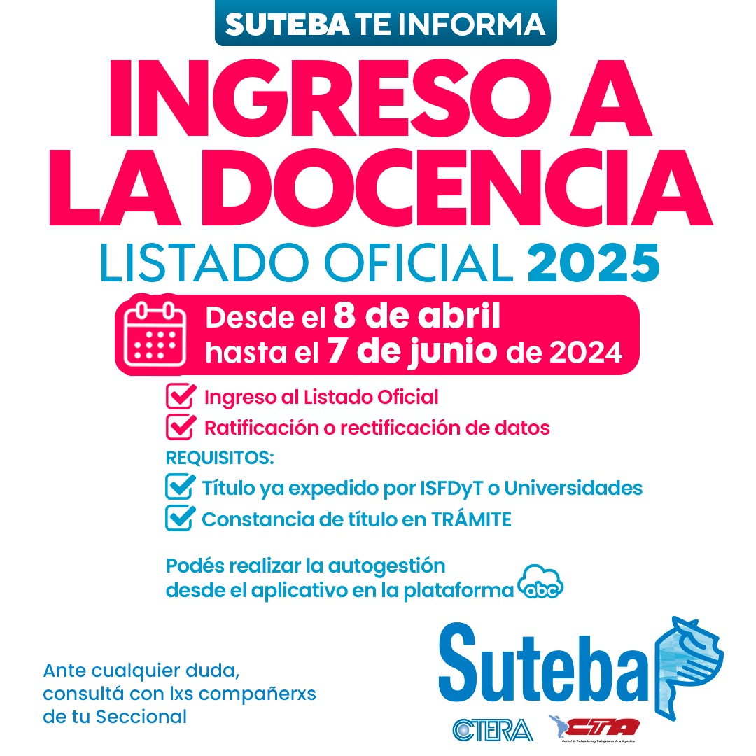 Desde el SUTEBA informamos que, del 8 de abril hasta el 7 de junio, podés inscribirte al Listado Oficial para ratificar o rectificar tus datos personales en la plataforma ABC, según lo dispuesto por la DGCyE con la publicación de las pautas y el cronograma para el Ingreso en la Docencia 2024 - Listado Oficial 2025.