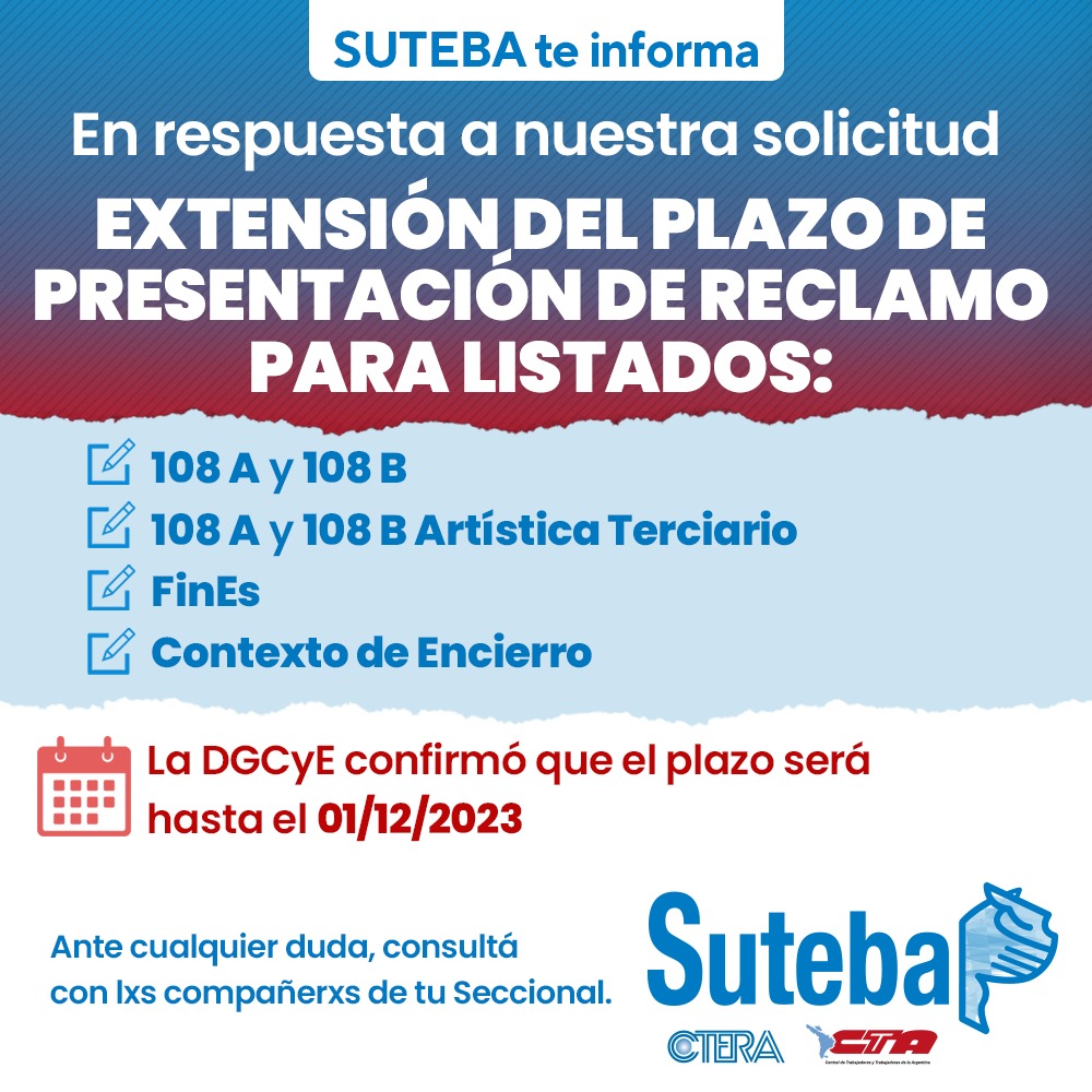 En el día de la fecha informamos que, a partir del planteo que realizó nuestra Organización Sindical en el marco del Frente de Unidad Docente Bonaerense, la DGCyE confirmó que se extiende el plazo de presentación de reclamo para los Listados 108 A y B, 108 A y B Artística Terciario, FinEs y Contexto de Encierro 2023/2024.