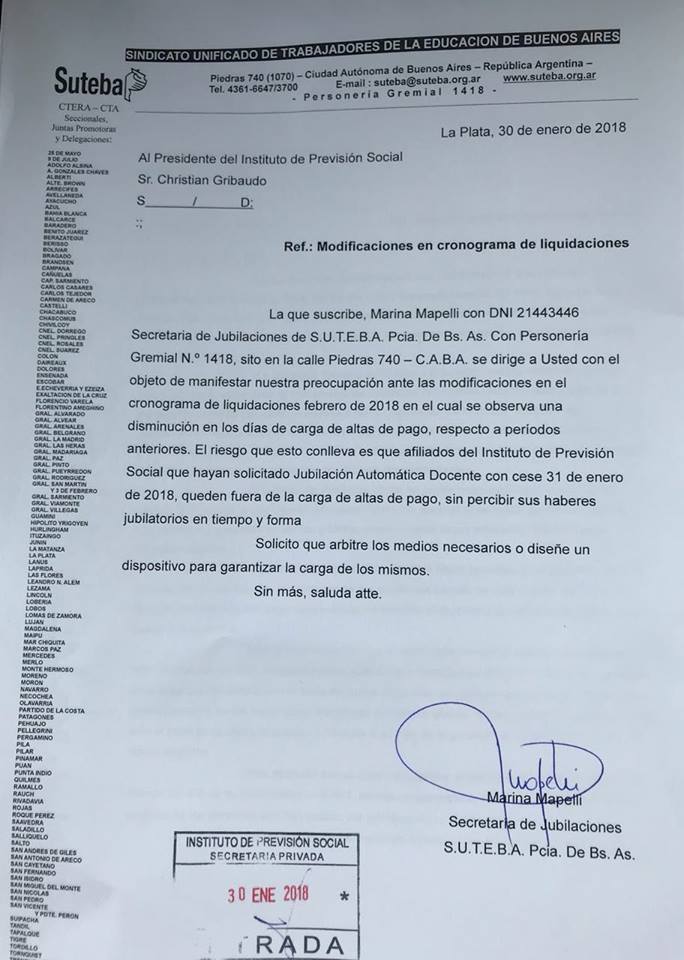 El martes 30, la Secretaría de Jubilaciones del SUTEBA se hizo presente en el IPS para manifestarle al Presidente Christian Gribaudo la preocupación del Sindicato respecto a ciertos cambios en el cronograma de liquidaciones del Instituto.