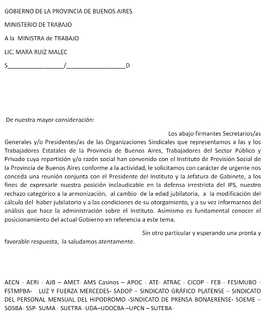 Los abajo firmantes Secretarios/as Generales y/o Presidentes/as de las Organizaciones Sindicales que representamos a las y los Trabajadores Estatales de la Provincia de Buenos Aires, Trabajadores del Sector Público y Privado cuya repartición y/o razón social han convenido con el Instituto de Previsión Social de la Provincia de Buenos Aires conforme a la actividad, le solicitamos con carácter de urgente nos conceda una reunión conjunta con el Presidente del Instituto y la Jefatura de Gabinete, a los fines de expresarle nuestra posición inclaudicable en la defensa irrestricta del IPS, nuestro rechazo categórico a la armonización, al cambio de la edad jubilatoria, a la modificación del cálculo del haber jubilatorio y a las condiciones de su otorgamiento, y a su vez informarnos del análisis que hace la administración sobre el Instituto. Asimismo, es fundamental conocer el posicionamiento del actual Gobierno en referencia a este tema.
